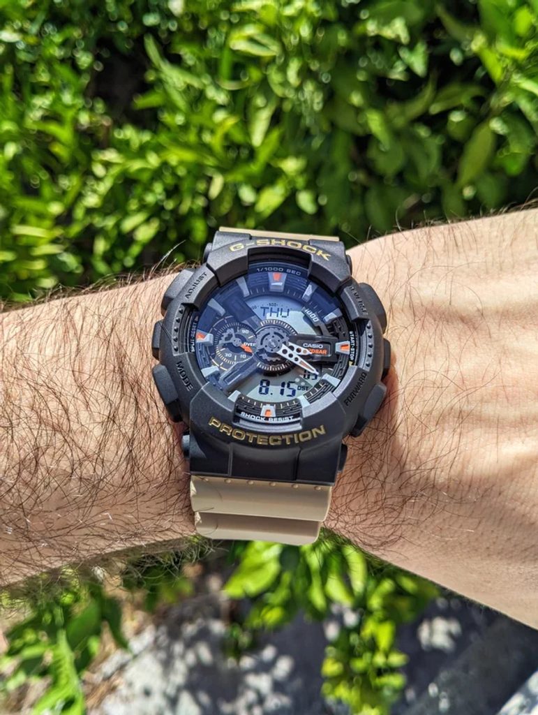 Casio G-Shock GA-110TU-1A5ER sa pridávajú k modelom využívajúcim tlmené zemité farby. Ciferník je kombinovaný (analógový a digitálny) a okrem času zobrazuje aj dátum, deň v týždni, stopky, budík a ďalšie funkcie. Digitálne displeje hodiniek sú pozitívne, a preto sú ľahko čitateľné aj na priamom svetle. Cestovateľov poteší najmä jednoduchá voľba medzi svetovými časmi. Pre lepšiu čitateľnosť za zhoršených svetelných podmienok sú ručičky hodiniek vybavené luminiscenciou a samozrejme nechýba ani LED osvetlenie displeja. Puzdro hodiniek, ktoré je vyrobené zo živice, dopĺňa gumový remienok s vynikajúcou odolnosťou a životnosťou. Vďaka použitým materiálom vážia hodinky príjemných 72 g. Ciferník je chránený minerálnym sklíčkom. Priemer puzdra 51,2 mm robí z hodiniek veľké hodinky. Vodotesnosť tohto modelu je 200 m, takže s hodinkami môžete bez problémov plávať.