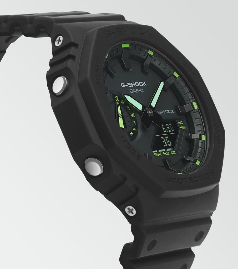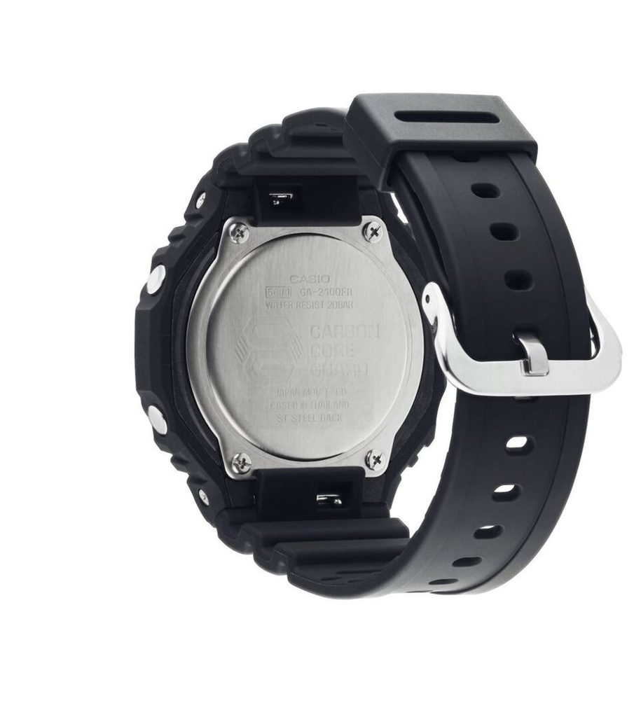 Casio G-Shock GA 2100-1A3 sú novým prírastkom do série Neon Accent. Prichádza, ako sme od tejto série očakávali, so spracovaním, vďaka ktorému vydrží vystavenie náročným podmienkam. Vysokú odolnosť puzdra zabezpečuje nová konštrukcia Carbon Core Guard. Tá je vyrobená zo živice, vystužená a spevnená uhlíkovými vláknami a špeciálny je aj dizajn tlačidiel, ktoré chránia model pred vniknutím nečistôt. Uvedená kombinácia umožňuje vytvoriť kompaktnejší a ľahší prístroj.