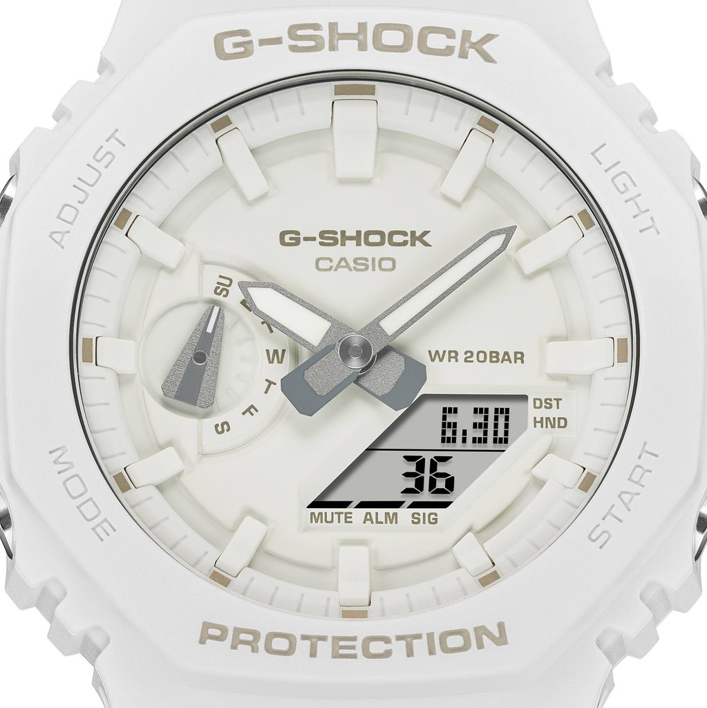 Casio G-Shock GA 2100-7A7 Tone-on-Tone sú odeté do obľúbenej bielej farby. Patrí do trojice modelov v jednofarebnom prevedení. Ďalšie dva modely sú odeté do tyrkysovej a fosforovožltej farby. Puzdro, remienok a dokonca aj jednotlivé komponenty ciferníka sú vyhotovené v jemne odlišných odtieňoch rovnakej farby. Napriek mestskému zameraniu kolekcie remeselné spracovanie hodiniek obstojí aj pri vystavení drsným podmienkam. Vysokú odolnosť puzdra zabezpečuje konštrukcia Carbon Core Guard. Tá je vyrobená zo živice, vystužená a spevnená uhlíkovými vláknami, špeciálna je aj konštrukcia gombíkov, ktoré chránia model pred vniknutím nečistôt. Uvedená kombinácia umožňuje vytvoriť kompaktnejší a ľahší prístroj.