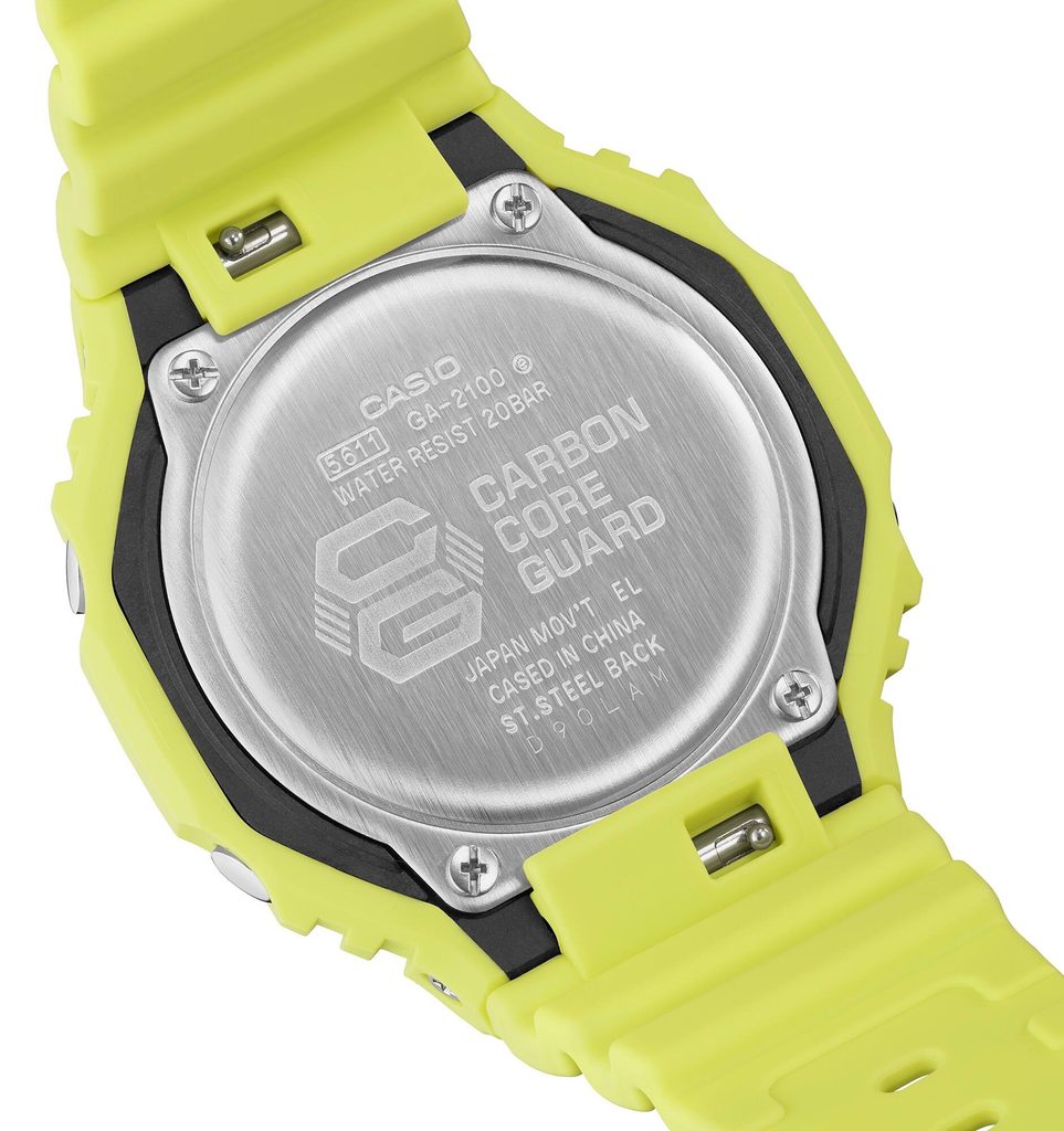 Casio G-Shock GA 2100-9A9 Tone-on-Tone sú odeté do obľúbenej fosforovožltej farby. Patrí do trojice modelov v jednofarebnom prevedení. Ďalšie dva modely sú odeté do tyrkysovej a bielej farby. Puzdro, remienok a dokonca aj jednotlivé komponenty ciferníka sú vyhotovené v jemne odlišných odtieňoch rovnakej farby. Napriek mestskému zameraniu kolekcie dokáže remeselné spracovanie hodiniek odolať vystaveniu náročným podmienkam. Vysokú odolnosť puzdra zabezpečuje konštrukcia Carbon Core Guard. Tá je vyrobená zo živice, vystužená a spevnená uhlíkovými vláknami, špeciálna je aj konštrukcia gombíkov, ktoré chránia model pred vniknutím nečistôt. Uvedená kombinácia umožňuje vytvoriť kompaktnejší a ľahší prístroj.