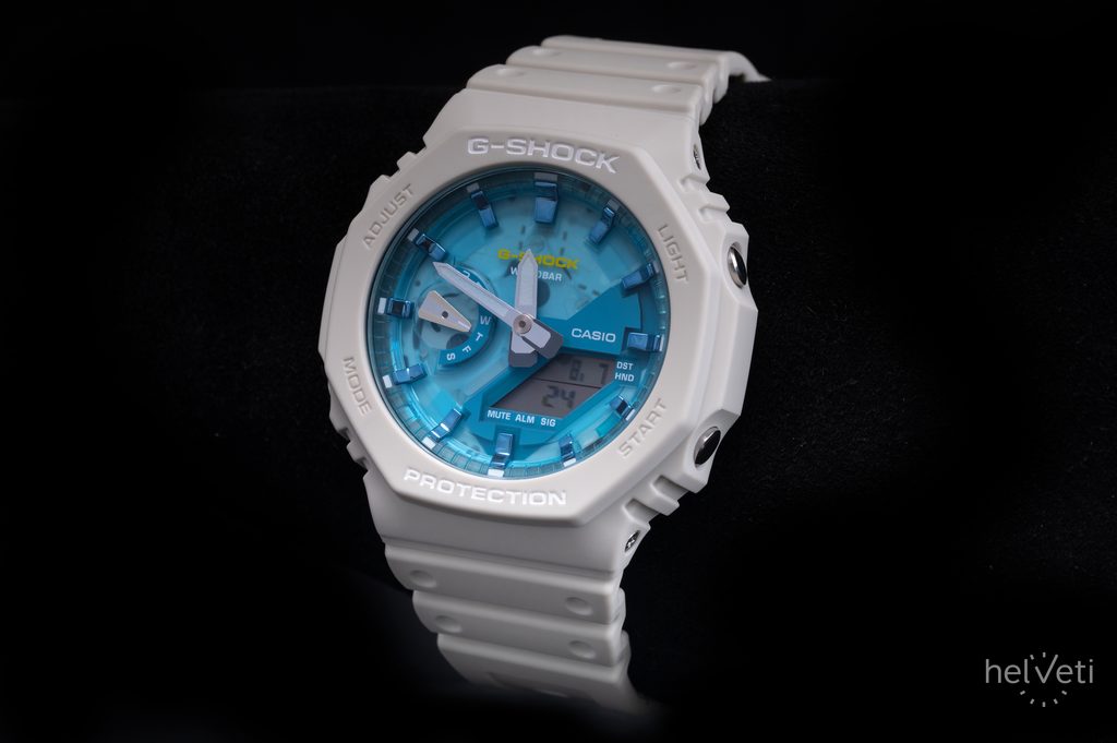 Casio G-Shock GA 2100AS-5A svojimi farbami evokujú leto. Ich polopriehľadný ciferník je inšpirovaný farbou chladnej modrej vody oázy pod žiarou letného slnka. Ani nový dizajn nemení remeselné spracovanie hodiniek, ktoré vydržia vystavenie náročným podmienkam. Vysokú odolnosť puzdra zabezpečuje konštrukcia Carbon Core Guard. Tá je vyrobená zo živice, vystužená a spevnená uhlíkovými vláknami, špeciálna je aj konštrukcia tlačidiel, ktoré chránia model pred vniknutím nečistôt. Uvedená kombinácia umožňuje vytvoriť kompaktnejší a ľahší prístroj.