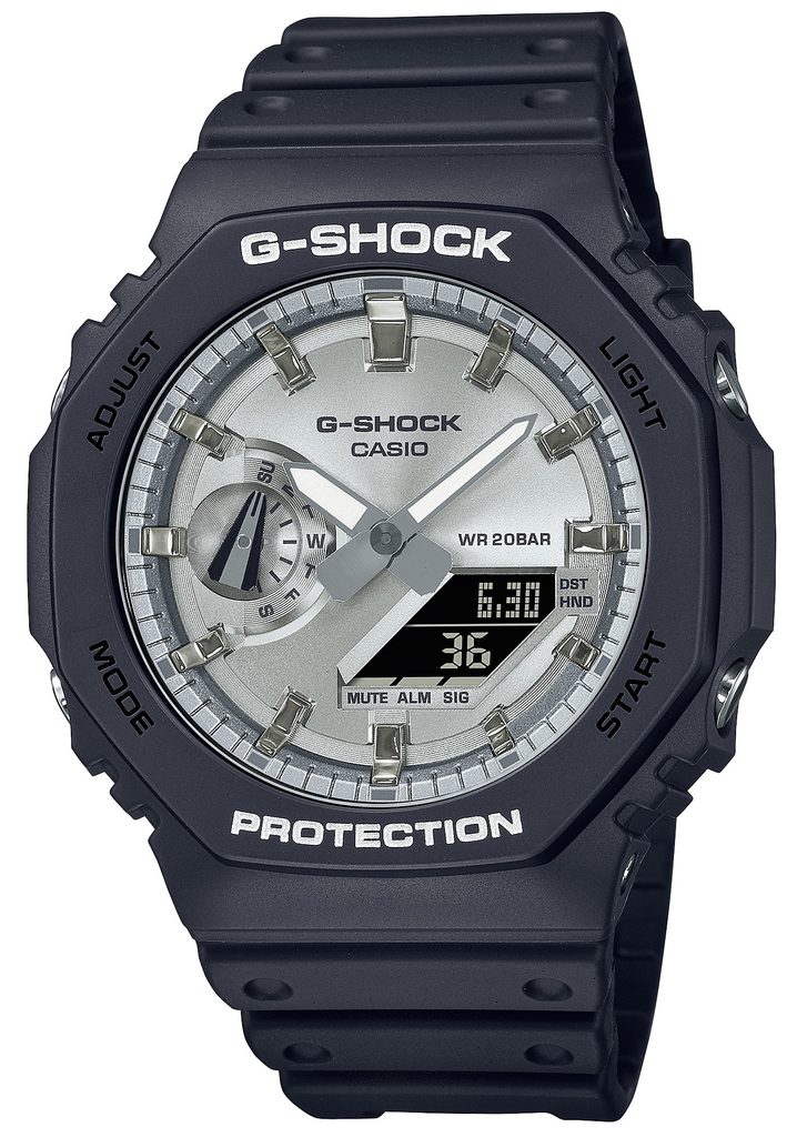 Casio G-Shock GA-2100SB-1A sú novým prírastkom, ktorý vďaka špeciálnej technike naparovania prináša kovový lesk ciferníka. Spracovanie hodiniek vydrží vystavenie náročným podmienkam. Vysokú odolnosť puzdra zabezpečuje nová konštrukcia Carbon Core Guard. Tá je vyrobená zo živice, vystužená a spevnená uhlíkovými vláknami, špeciálna je aj konštrukcia tlačidiel, chrániaca model pred vniknutím nečistôt. Uvedená kombinácia umožňuje vytvoriť kompaktnejší a ľahší prístroj.