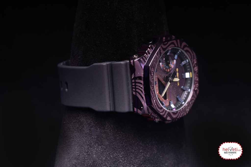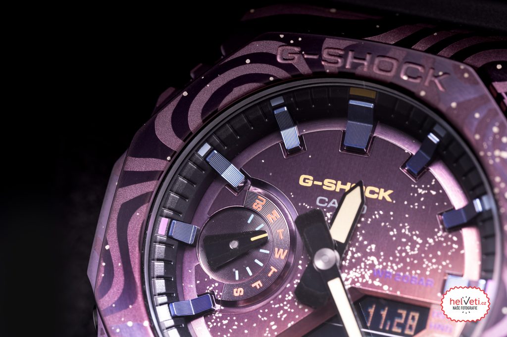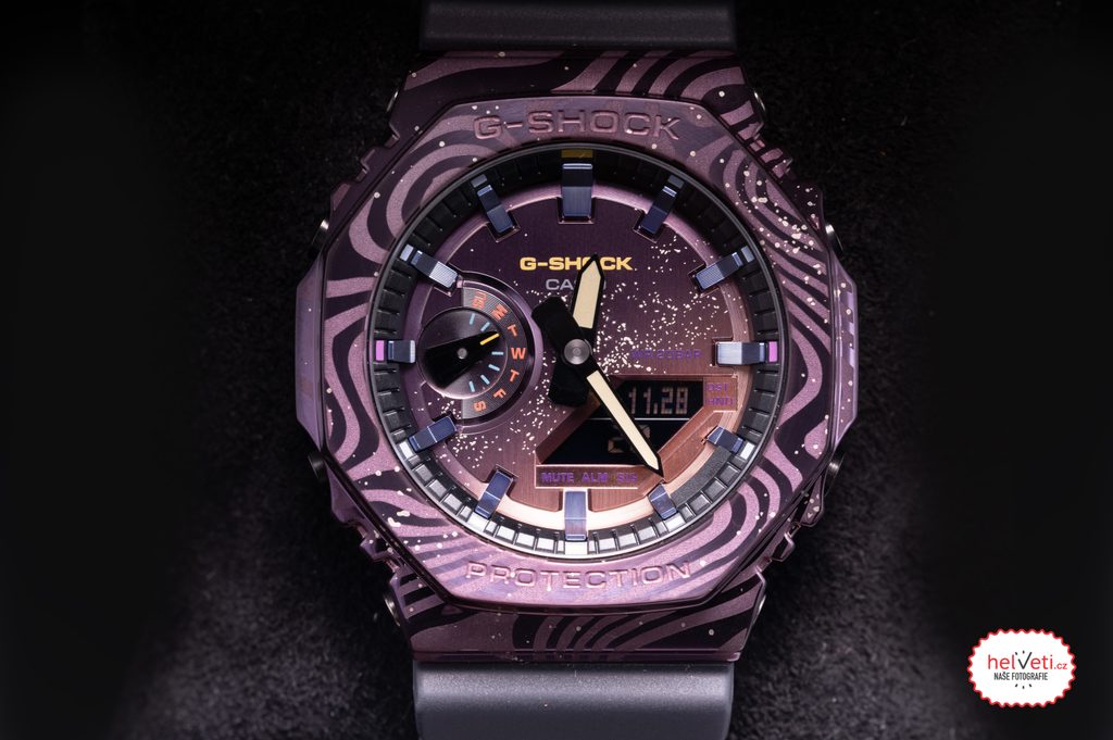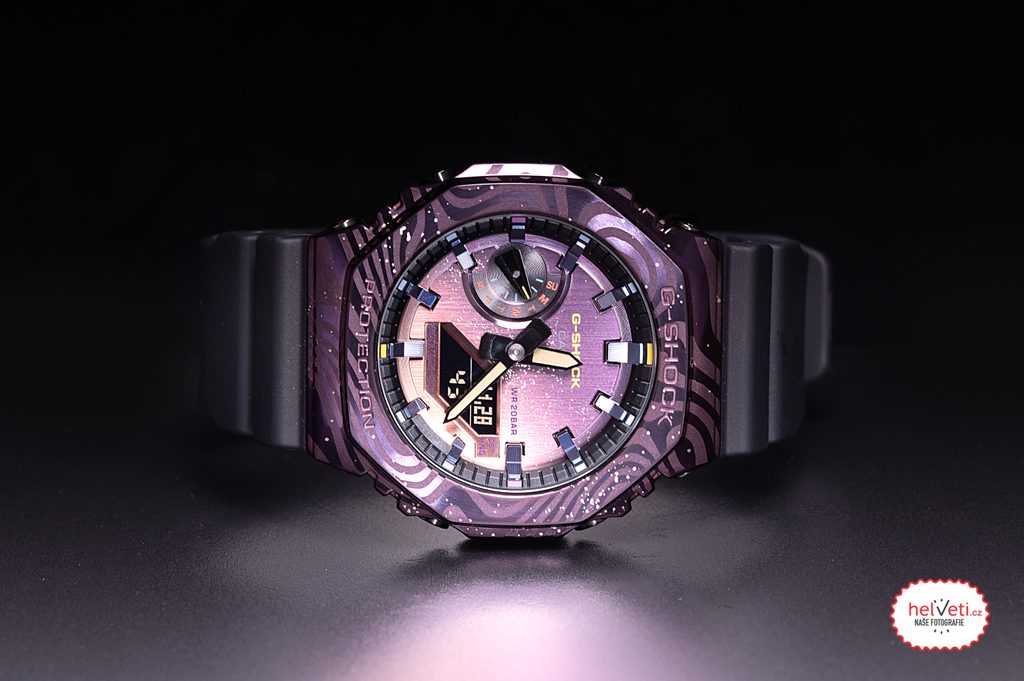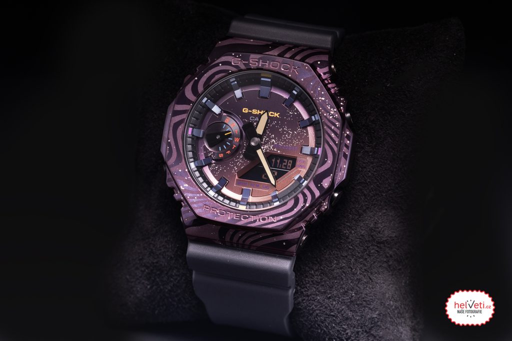 Casio G-Shock GM-2100MWG-1AER Milky Way Galaxy Edition sú špeciálnym prírastkom do obľúbenej série kovových hodiniek "CasiOak", ktoré sa vyznačujú osemuholníkovým puzdrom.