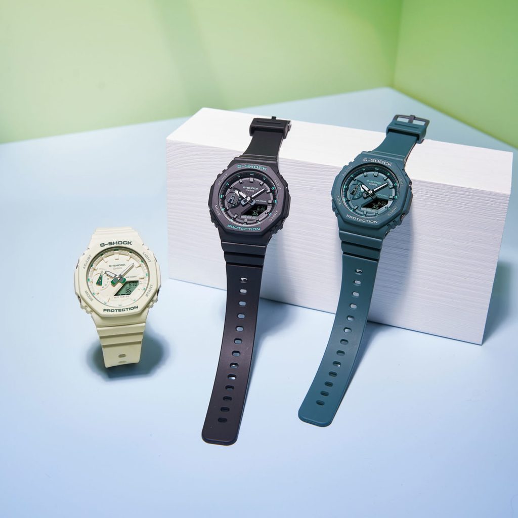 Casio G-Shock GMA S2100GA-1A prichádzajú, ako sme od tejto série zvyknutí, s kvalitou spracovania, vďaka ktorej hodinky vydržia vystavenie náročným podmienkam. Vysokú odolnosť puzdra zabezpečuje nová konštrukcia Carbon Core Guard. Tá je vyrobená zo živice, vystužená a spevnená uhlíkovými vláknami, a špeciálna je aj konštrukcia tlačidiel, ktorá chráni model pred vniknutím nečistôt. Uvedená kombinácia umožňuje vytvoriť kompaktnejší a ľahší prístroj.