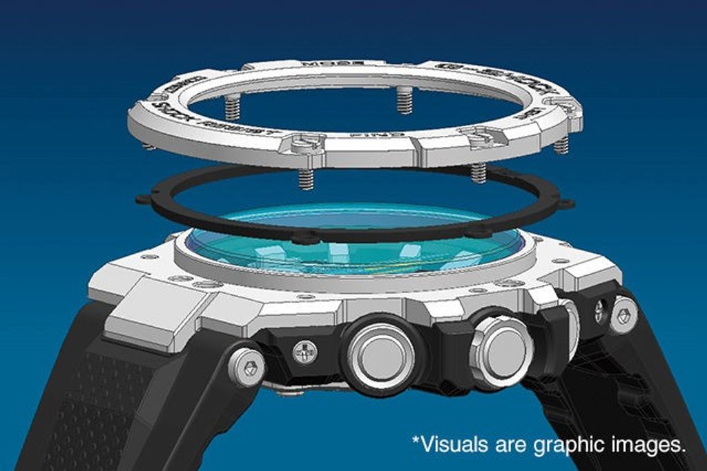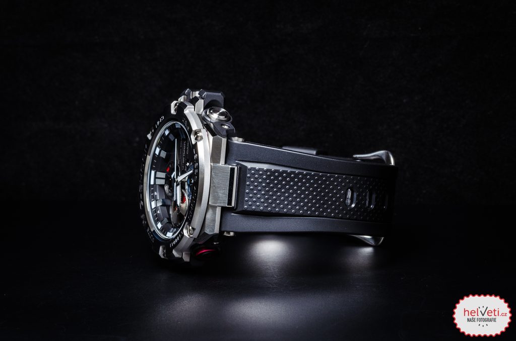 Puzdro hodiniek dopĺňa gumový remienok. Ciferník je chránený minerálnym sklíčkom. Lepšiu čitateľnosť za zhoršených svetelných podmienok zabezpečuje aplikácia luminiscenčnej vrstvy na ručičky, okrem toho sú hodinky vybavené LED osvetlením displeja. Priemer puzdra 54 mm robí z hodiniek Casio GST-B100-1AER veľké hodinky. Vodotesnosť tohto modelu je 200 m, takže s hodinkami môžete bez problémov plávať a venovať sa potápaniu bez dýchacieho prístroja.
