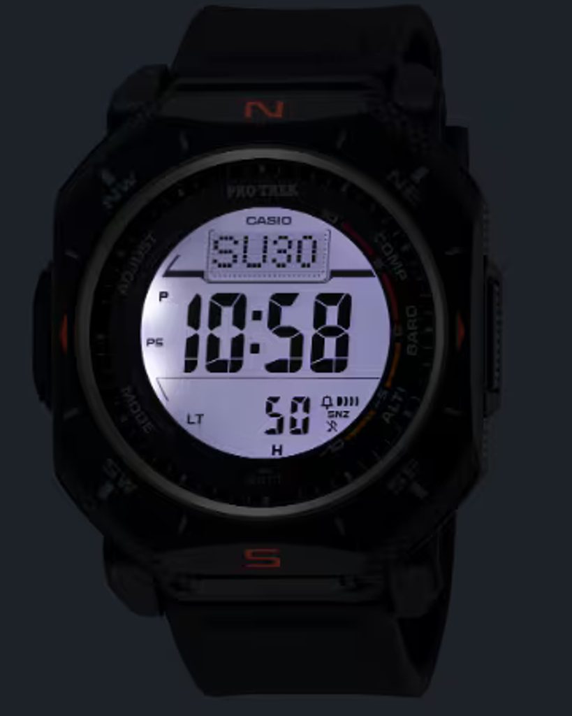 Casio ProTrek PRG-69-1ER sú vybavené trojitým snímačom, ktorý ponúka funkcie užitočné v prírode. Digitálny kompas, teplomer merajúci v rozsahu -10 - 60 °C a barometer + výškomer schopný merať v rozsahu -700 až 10 000 m. Všetky tri funkcie sú rýchlo a intuitívne dostupné pod tlačidlami na pravej strane puzdra. Digitálny displej zaručuje veľmi dobrú čitateľnosť aj za zhoršených svetelných podmienok vďaka LED podsvieteniu.