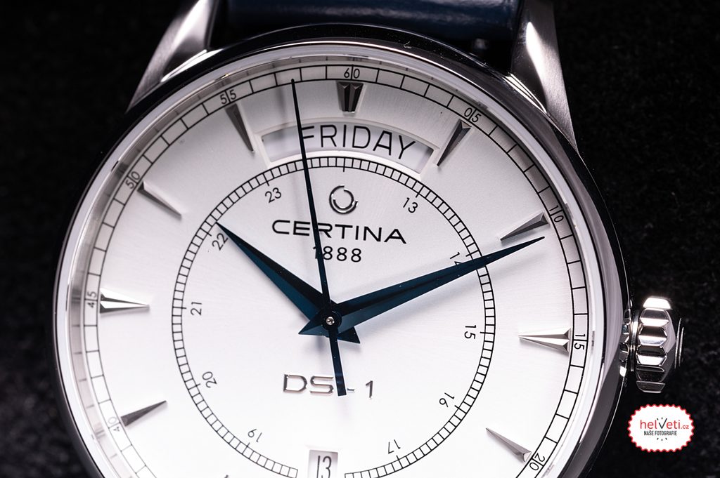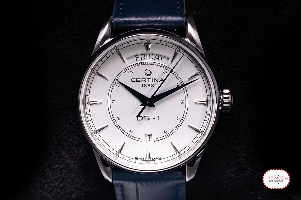 Hodinky Certina C029.430.16.011.00 patriado série DS-1. Detailne prepracovaný ciferník je chránený zafírovým sklíčkom odolným voči poškriabaniu. Sklo je na jednej strane pokryté antireflexnou vrstvou, ktorá umožňuje plynulé čítanie času aj na priamom slnečnom svetle. Puzdro hodiniek je vyrobené z nehrdzavejúcej ocele a hodinky na zápästí drží modrý kožený remienok s rýchloupínacími stožiarmi a motýľovou sponou. Vodotesnosť hodiniek je 100 m, takže sú vhodné na plávanie a ľahké potápanie. Zvláštnosťou je veľký ukazovateľ dňa v týždni na pozícii dvanástej hodiny a na šiestej hodine nájdeme ukazovateľ dátumu.