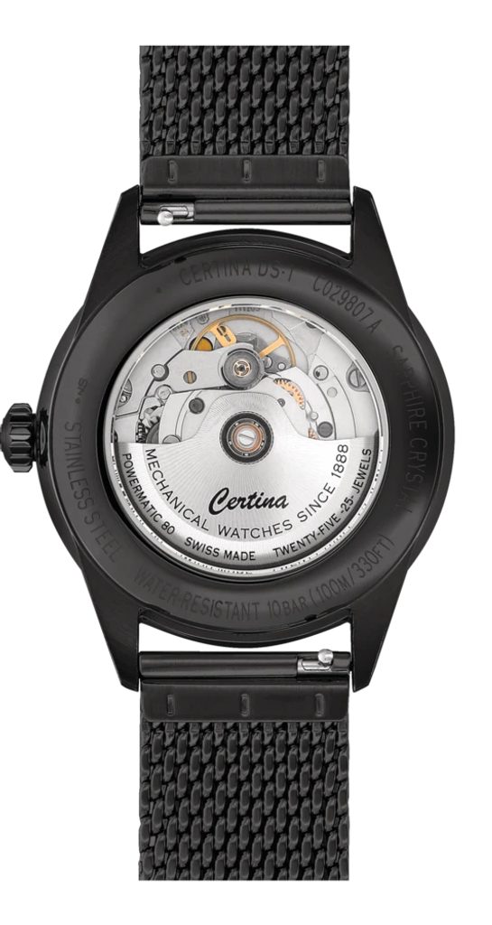 Hodinky Certina C029.807.33.051.00 patriado modelového radu DS-1. Detailne prepracovaný ciferník je chránený zafírovým sklíčkom odolným voči poškriabaniu. Sklo je na jednej strane pokryté antireflexnou vrstvou, ktorá umožňuje plynulé čítanie času aj na priamom slnečnom svetle. Puzdro hodiniek je vyrobené z ušľachtilej ocele v čiernej PVD úprave a na zápästí ho drží pletený oceľový náramok, tiež v čiernej PVD úprave. Vodotesnosť hodiniek je 100 m, takže sú vhodné na plávanie a ľahké potápanie.