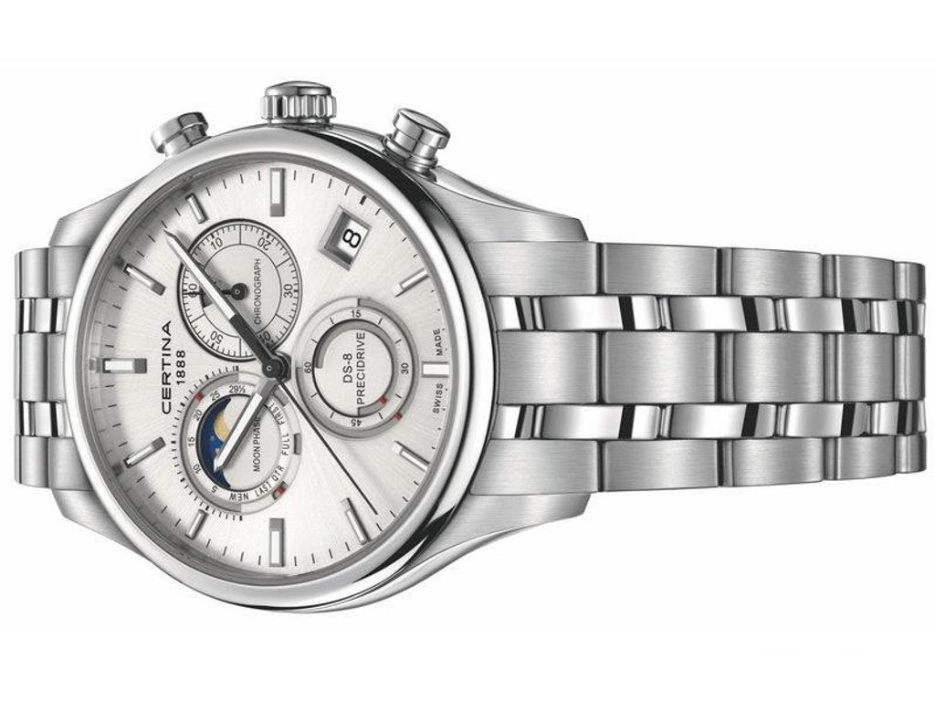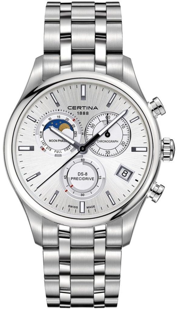 Hodinky Certina C033.450.11.031.00 patria do modelového radu DS 8. Detailne spracovaný ciferník je chránený antireflexným zafírovým sklíčkom, ktoré je odolné voči akémukoľvek poškriabaniu a je dokonale čitateľné aj na priamom slnečnom svetle. Puzdro hodiniek je vyrobené z nehrdzavejúcej ocele vrátane strojčeka. Vodotesnosť hodiniek je 100 m, takže sú vhodné na plávanie a ľahké potápanie. Hodinky Certina Moonphase majú ukazovateľ dátumu, stopky a ukazovateľ fázy mesiaca.