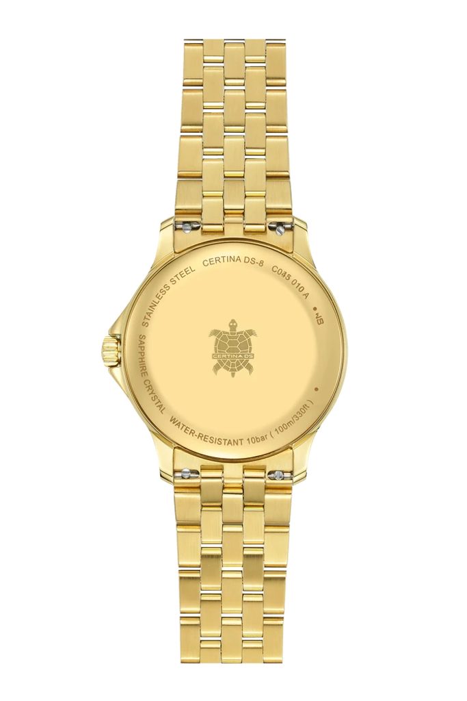 Hodinky Certina C045.010.33.361.00 patriace do modelového radu DS-8 Lady majú dátumovku a vodotesnosť 100 m (10 bar ) - sú vhodné na pravidelné plávanie. Detailne prepracovaný ciferník v šampanskej farbe je chránený antireflexným zafírovým sklíčkom, ktoré je odolné voči akémukoľvek poškriabaniu. Puzdro hodiniek vrátane strojčeka je vyrobené z nehrdzavejúcej ocele s PVD úpravou.