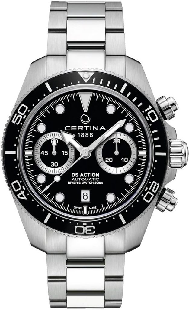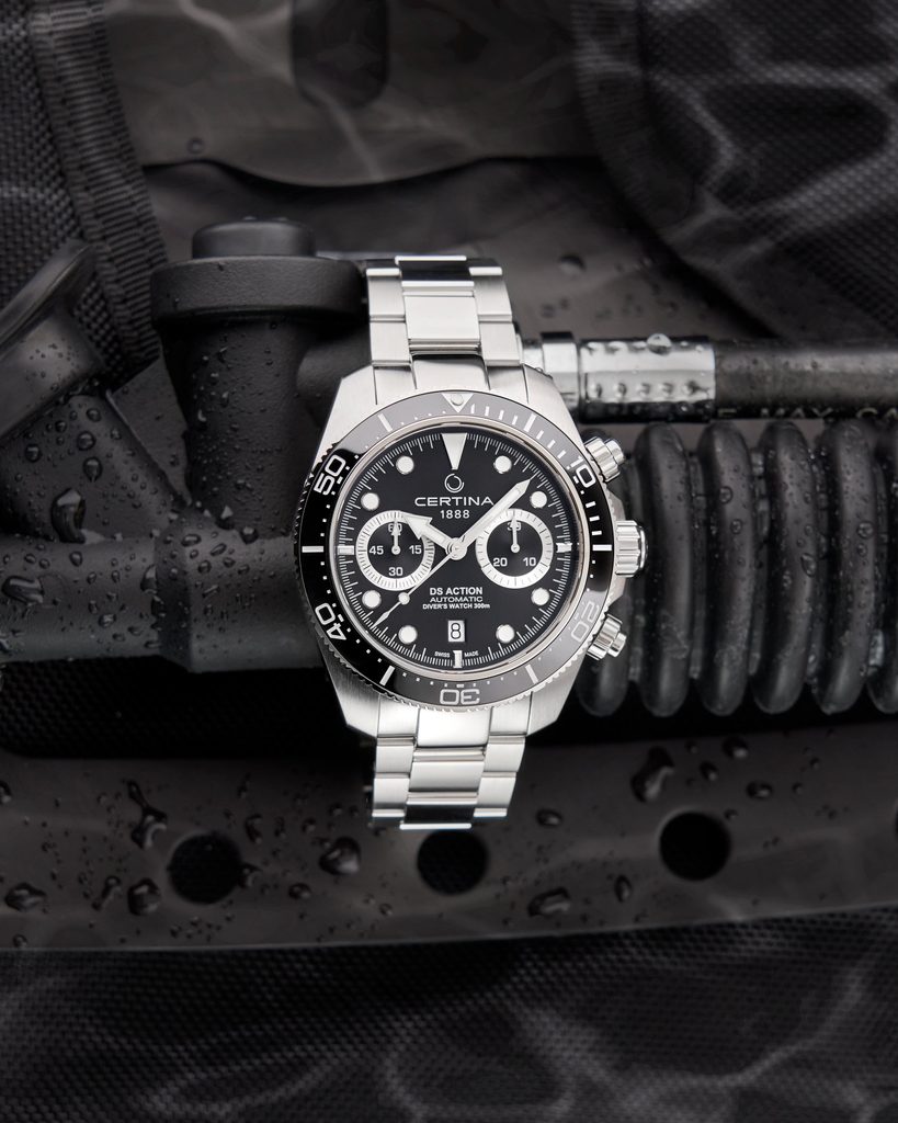 Hodinky Certina C0328271105100, ktoré patria do modelového radu DS Action , majú dátumovku umiestnenú na šiestej hodine, jednosmerne otočnú potápačskú lunetu s keramickou vložkou a chronograf. Detailný ciferník je chránený antireflexným zafírovým sklíčkom, ktoré je odolné voči akémukoľvek poškriabaniu a vďaka antireflexnej vrstve je ciferník čitateľný aj na ostrom slnečnom svetle. Puzdro hodiniek je vyrobené z nehrdzavejúcej ocele vrátane strojčeka. Vodotesnosť hodiniek je 300 m, a sú tak vhodné na hlbokomorské potápanie. Ručičky a indexy na ciferníku sú potiahnuté luminiscenčnou vrstvou Super-LumiNova®, takže sa nemusíte obávať, že by ciferník nebol dobre čitateľný za zhoršených viditeľných podmienok.