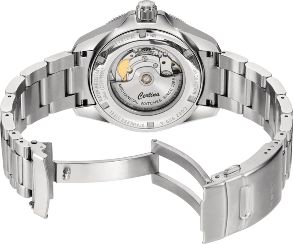 Hodinky Certina C032.929.11.051.00, ktoré patria do modelového radu DS Action Automatic , majú dátumovku, skrutkovateľnú korunku a skrutkovacie puzdro. Medzi funkciami hodinky ponúkajú aj druhý čas - GMT. Detailne spracovaný ciferník je chránený antireflexným zafírovým sklíčkom, ktoré je odolné voči akémukoľvek poškriabaniu. Puzdro hodiniek vrátane náťahu je vyrobené z leštenej nehrdzavejúcej ocele 316L. Vodotesnosť tohto modelu je 200 M - je teda vhodný na plávanie alebo hlbokomorské potápanie. Ručičky a indexy na ciferníku sú vybavené luminiscenčnou vrstvou Super-LumiNova®, takže sa nemusíte obávať, že by ciferník nebol dobre čitateľný za zhoršených viditeľných podmienok.