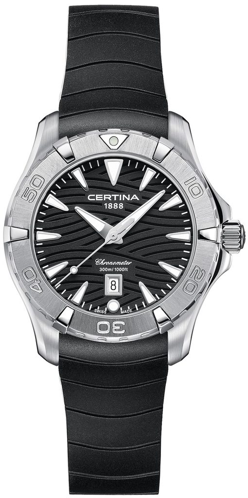 Hodinky Certina C032.251.17.051.00 , ktoré patria do modelového radu DS Action Lady , disponujú dátumovkou a vodotesnosťou do 30 ATM. Detailne prepracovaný ciferník je chránený antireflexným zafírovým sklíčkom, ktoré je odolné voči akémukoľvek poškriabaniu a vďaka antireflexnej vrstve je ciferník čitateľný aj na ostrom slnku. Puzdro hodiniek je vyrobené z nehrdzavejúcej ocele a remienok je gumový.