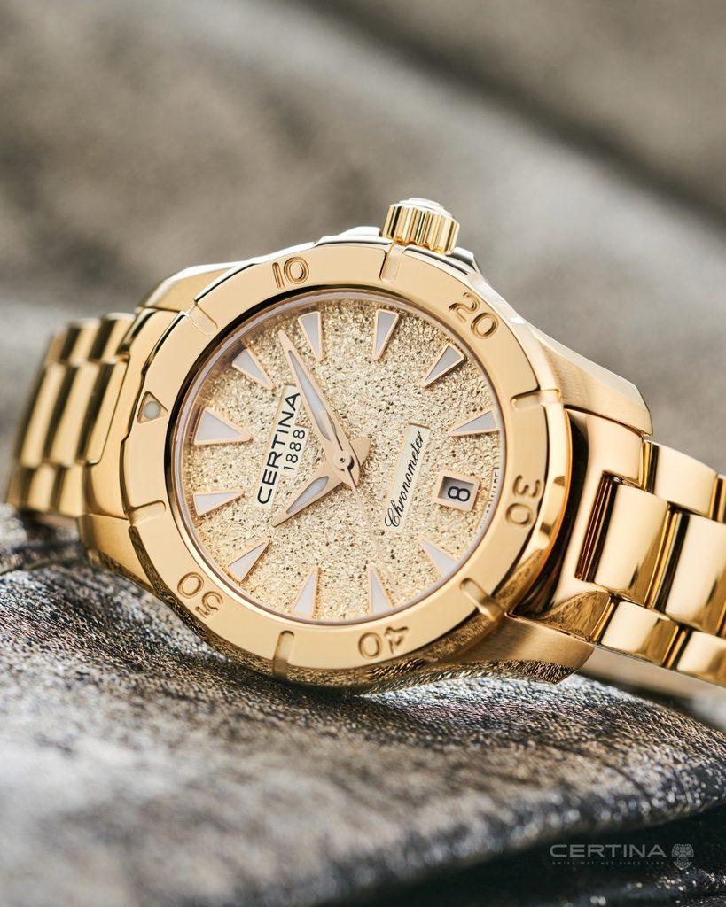 Hodinky Certina C032.951.33.361.00 , ktoré patria do modelového radu DS Action Lady , disponujú dátumovkou a vodotesnosťou do 20 ATM. Vzorovaný žltý ciferník je chránený antireflexným zafírovým sklíčkom, ktoré je odolné voči akémukoľvek poškriabaniu, a vďaka antireflexnej vrstve je ciferník čitateľný aj na ostrom slnku. Puzdro hodiniek vrátane strojčeka je vyrobené z nehrdzavejúcej ocele s povrchovou úpravou PVD zo žltého zlata.
