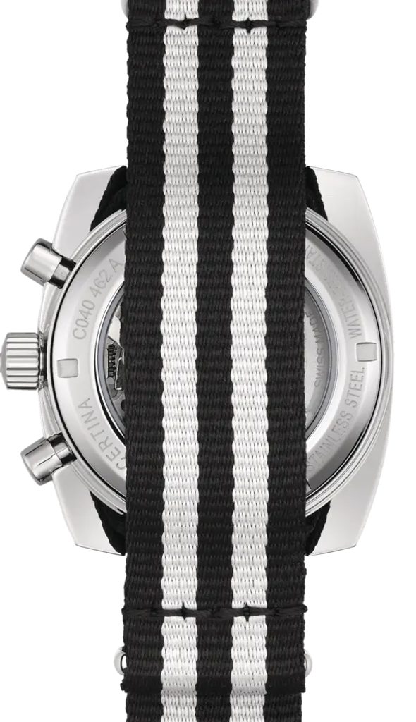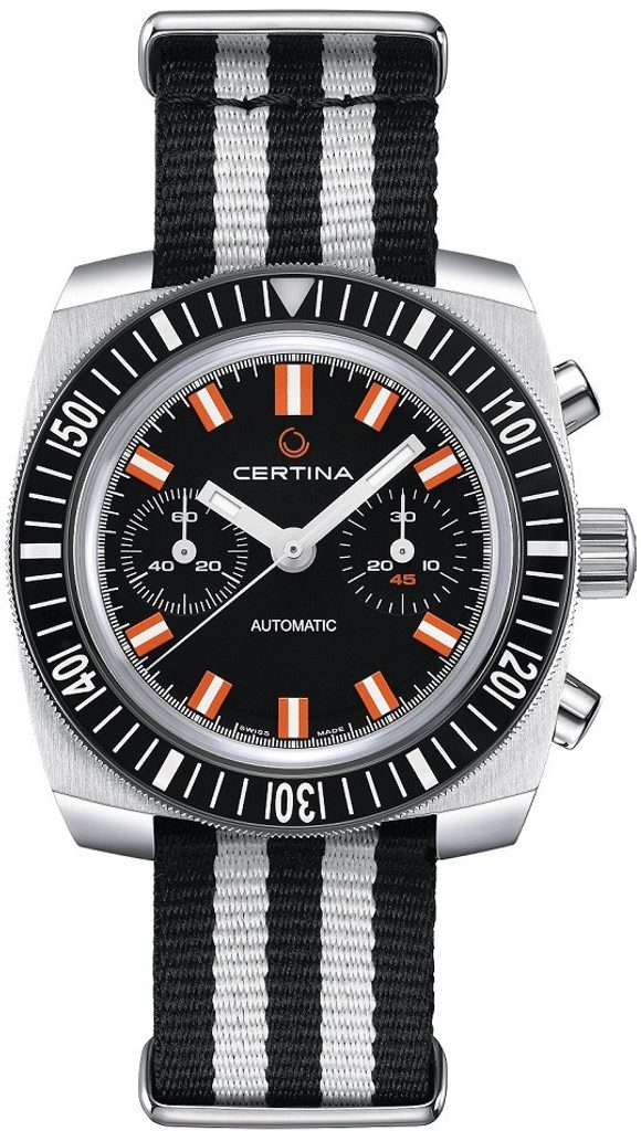 Hodinky Certina C040.462.18.051.00, ktoré sú súčasťou série DS Chronograph, sú novinkou na rok 2022. Detailný retro ciferník chráni kupolovité zafírové sklíčko odolné proti poškriabaniu. Sklo je na jednej strane pokryté antireflexnou vrstvou , ktorá umožňuje plynulé čítanie času aj na priamom slnečnom svetle. Puzdro hodiniek je vyrobené z nehrdzavejúcej ocele a na zápästí ich drží remienok NATO z recyklovaného plastu.Hodinky sú vodotesné do 200 m, takže sú vhodné na plávanie a potápanie. Hodinky majú funkciu stopiek s meraním do 30 minút.
