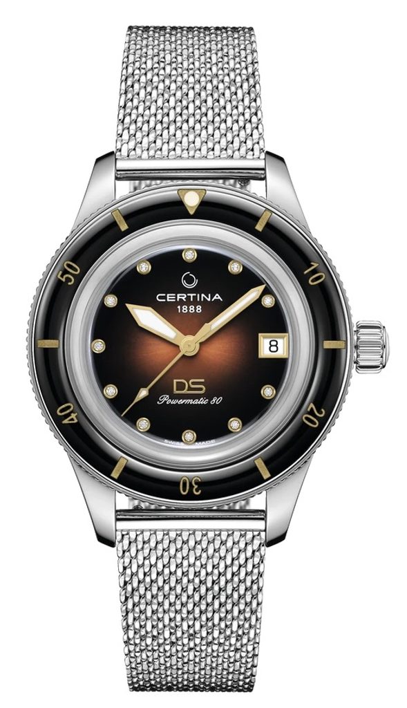 Hodinky Certina C036.207.11.296.00 , ktoré sú súčasťou modelového radu DS PH200M ( PH = "Pression Hydrostatique 200 mètres") , majú dátumovku a skrutkovací strojček. Detailne prepracovaný hnedý perleťový ciferník je chránenýzafírovým sklíčkom , ktoré je vysoko odolné proti poškriabaniu. Na pozíciách indexov sa nachádza 11 diamantov. Puzdro hodiniek je vyrobené z brúsenej ušľachtilej ocele 316L. Hodinky sa dodávajú na pletenom oceľovom remienku s rýchloupínacími stožiarmi. Vďaka jednosmernej, potápačskej lunete tieto hodinky ešte viac zdôrazňujú svoj potápačský štýl. Vodotesnosť hodiniek je 200 m, vďaka čomu sú vhodné na hlbokomorské potápanie. Ručičky sú vybavené luminiscenčnou vrstvou, takže sa nemusíte obávať, že by ciferník nebol dobre čitateľný za zhoršených viditeľných podmienok.