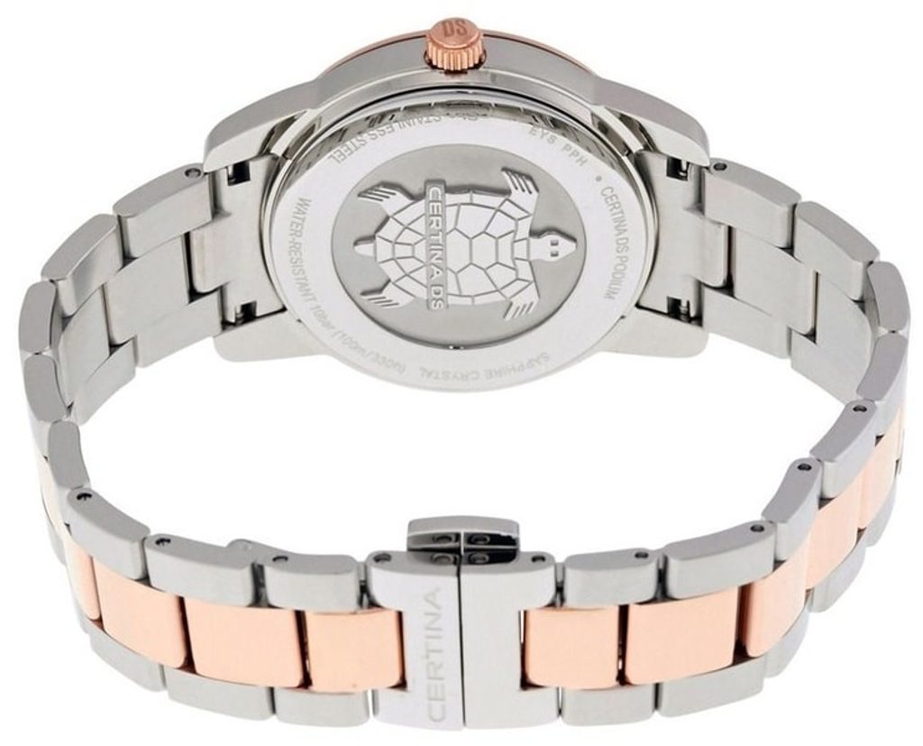 Hodinky Certina C034.210.22.087.00 , ktorépatria do modelového radu DS Podium Lady ,sú vybavené ukazovateľom dátumu. Detailne prepracovaný ciferník chráni antireflexné zafírové sklíčko odolné voči poškriabaniu. Hodinky sú vyrobené z ušľachtilej ocele, ktorá je farebne upravená PVD úpravou. Vodotesnosť hodiniek je 100 m, takže sú vhodné na plávanie a ľahké potápanie.