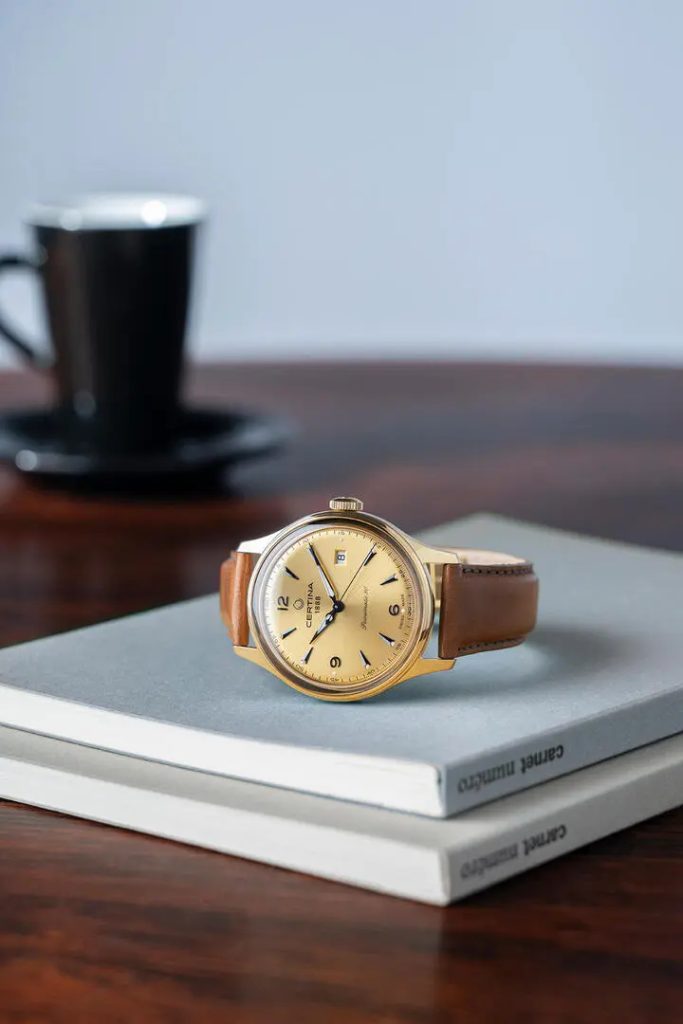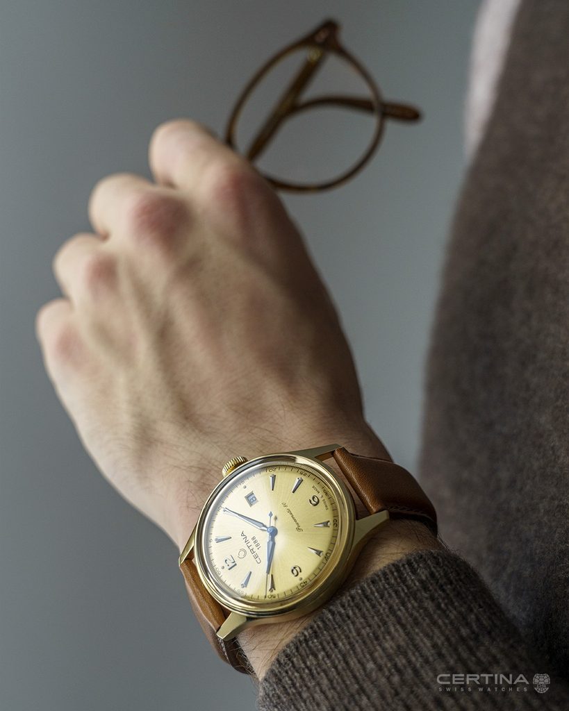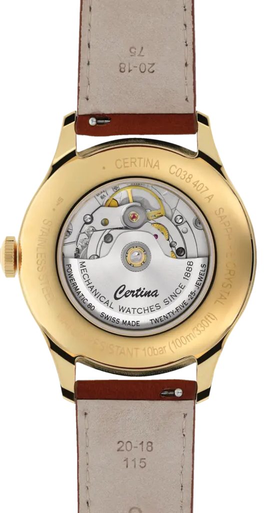 Hodinky Certina C038.407.36.367.00 sú novinkou na rok 2021 a inšpirujú sa hodinkami Certina DS Chronograph Automatic C038.462.16.037.00. Podobnosť nájdeme najmä na ciferníku zlatej farby, kde sú použité rovnaké indexy a číslice. Jeho detailný dizajn vyniká jednoduchosťou a prehľadnosťou. Tie "narúša" len dátum, ktorý sa nachádza na tretej hodinovej pozícii. Ciferník je chránený zafírovým sklíčkom odolným proti poškriabaniu. Sklo je na jednej strane pokryté antireflexnou vrstvou, ktorá umožňuje bezproblémové čítanie času aj na priamom slnečnom svetle. Puzdro hodiniek je vyrobené z nehrdzavejúcej ocele s PVD úpravou a na zápästí ho drží hnedý kožený remienok s rýchloupínacou retiazkou. Vodotesnosť hodiniek je 100 m, takže sú vhodné na plávanie a šnorchlovanie.