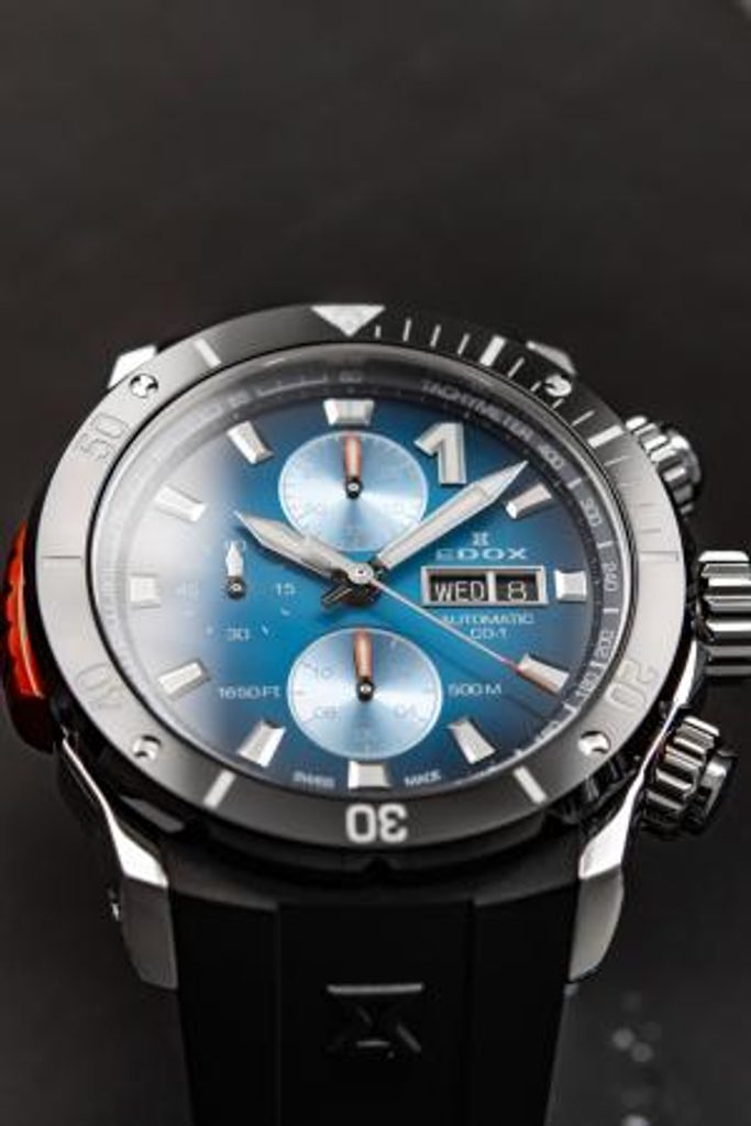 Pánske hodinky Edox Chronograph Automatic s lunetovým uzamykacím systémom, puzdro je vyrobené z chirurgickej ocele 316L, priemer puzdra je 45 mm, o presný chod hodiniek sa stará kaliber 011S - ide o švajčiarsky strojček Sellita SW500.