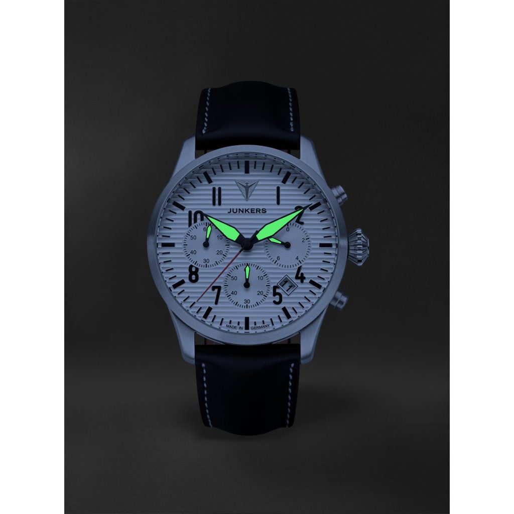 Hodinky Junkers 955.01.03 majú puzdro vyrobené z ušľachtilej ocele, v ktorom sa nachádza japonský batériový strojček Miyota 6S20. Má ukazovateľ dátumu na pozícii 4 - 5 hodín a stopky s presnosťou 1/20 sekundy (počítadlo na pozícii 3 hodín). Subciferník na pozícii 9 hodín patrí minútovému počítadlu stopiek, veľká sekundová ručička tiež patrí stopkám a na pozícii 6 hodín nájdeme mimo stredovej sekundovej ručičky. Ciferník má pilotný štýl, ktorý hodinkám dodáva skvelú čitateľnosť. Hodinky sa dodávajú so štýlovým koženým remienkom.