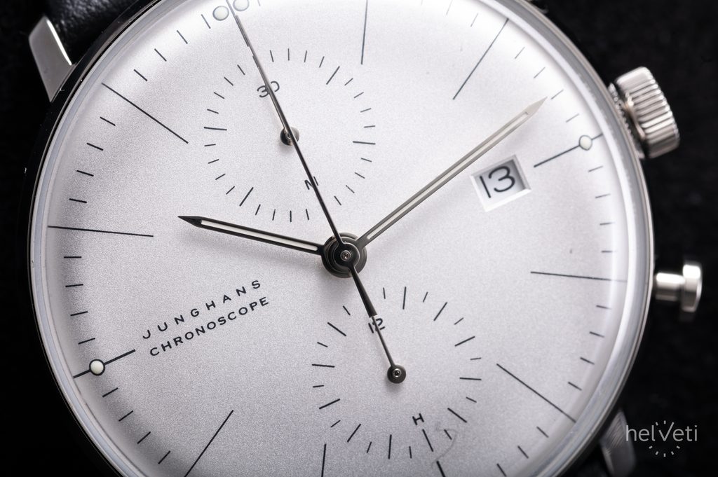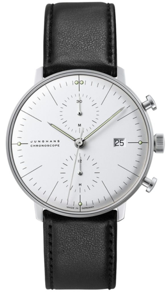 Ciferník je inšpirovaný jednoduchosťou umeleckého štýlu Bauhaus. Dizajn hodiniek navrhol pre spoločnosť Junghans švajčiarsky architekt, sochár a dizajnér Max Bill v 60. rokoch 20. storočia a odvtedy sa prakticky nezmenil. Chráni ho zafírové sklíčko, ktoré je maximálne odolné proti poškriabaniu. Obojstranná antireflexná vrstva zaručuje vynikajúcu čitateľnosť aj na priamom slnečnom svetle. Dátumovka sa nachádza na 3. hodine. Ďalšou funkciou tohto modelu sú stopky. Puzdro s priemerom 40 mm ocenia aj milovníci menších pánskych hodiniek. Vodotesnosť tohto modelu je 50 metrov, takže zvládne kontakt s vodou, napríklad dážď alebo sprchu.