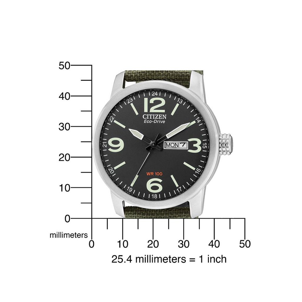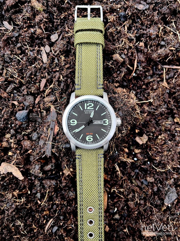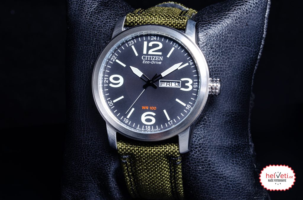 Púzdro hodiniek Citizen BM8470-11EE je vyrobené z nehrdzavejúcej ocele, remienok je kombináciou textilu a kože. Vo vnútri puzdra spoľahlivo pracuje vlastný strojček Citizen E101, ktorý je vybavený ľahko dobíjateľnou batériou s rezervou chodu až na 6 mesiacov a tiež funkciou indikátora vybitia batérie skokovým ukazovateľom sekundovej ručičky po 2 sekundách. Praktickou funkciou je potom ukazovateľ dátumu a deň v týždni na tradičnej pozícii 3 hodín.