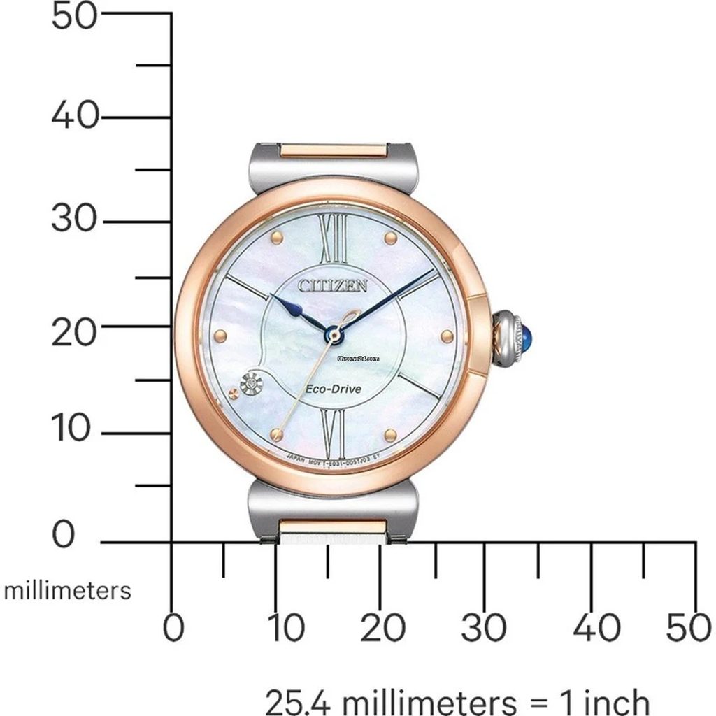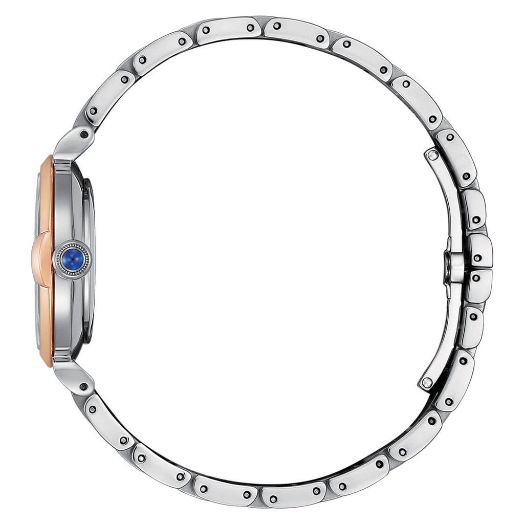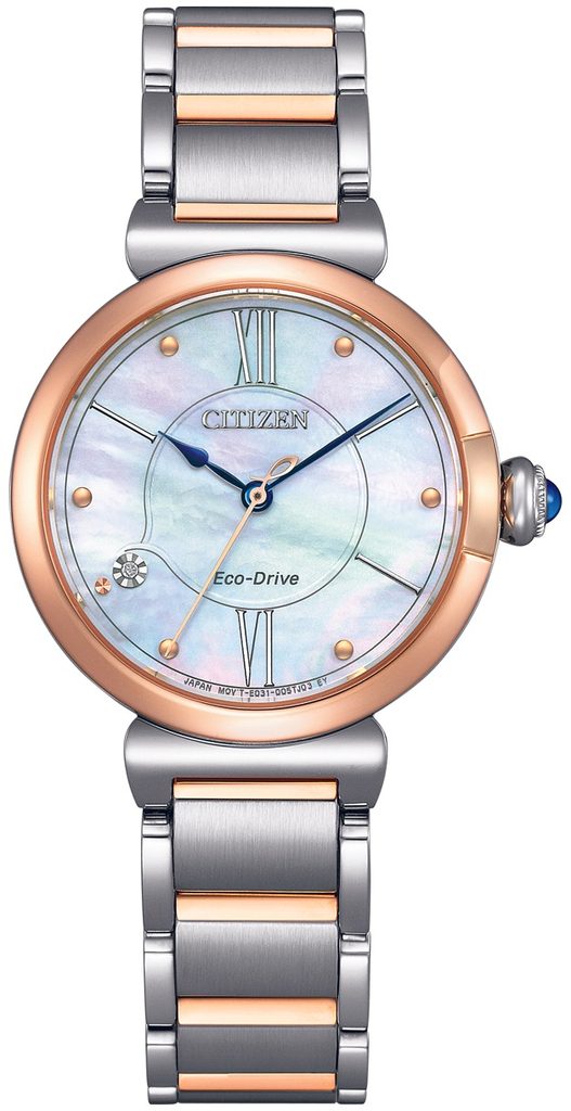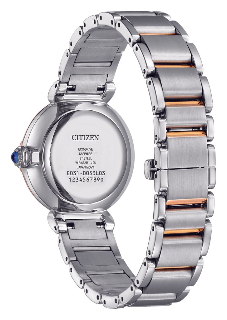 Hodinky Citizen EM1074-82D majú puzdro z ušľachtilej ocele s čiastočnou PVD úpravou v ružovom zlate a dopĺňa ich vkusný oceľový náramok s rovnakou úpravou. Vnútri puzdra spoľahlivo pracuje vlastný strojček Citizen E031, ktorý je vybavený ľahkou dobíjacou batériou s rezervou energie až 6 mesiacov a má aj funkciu indikátora vybitia batérie.