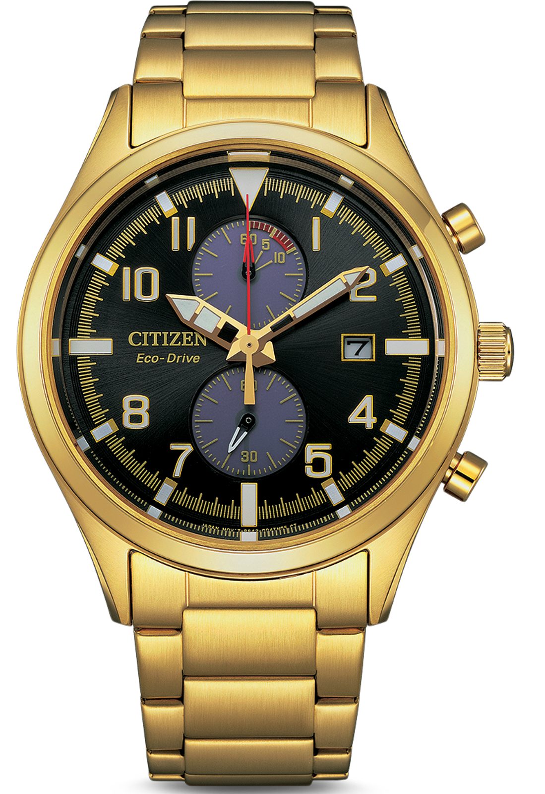 Puzdro hodiniek Citizen CA7022-87E je vyrobené z nehrdzavejúcej ocele s PVD úpravou zlatej farby, rovnako ako ich náramok. Vo vnútri tohto puzdra pracuje vlastný strojček Citizen B642, ktorý je vybavený funkciou stopiek a ukazovateľom dátumu na pozícii 3 hodín. Tento strojček poháňa technológia Eco-Drive, batéria nabíjaná svetlom s rezervou energie až 7 mesiacov. Zaujímavou funkciou stopiek je plynulý chod sekundovej ručičky, ktorá umožňuje meranie času s presnosťou na 1/5 sekundy.