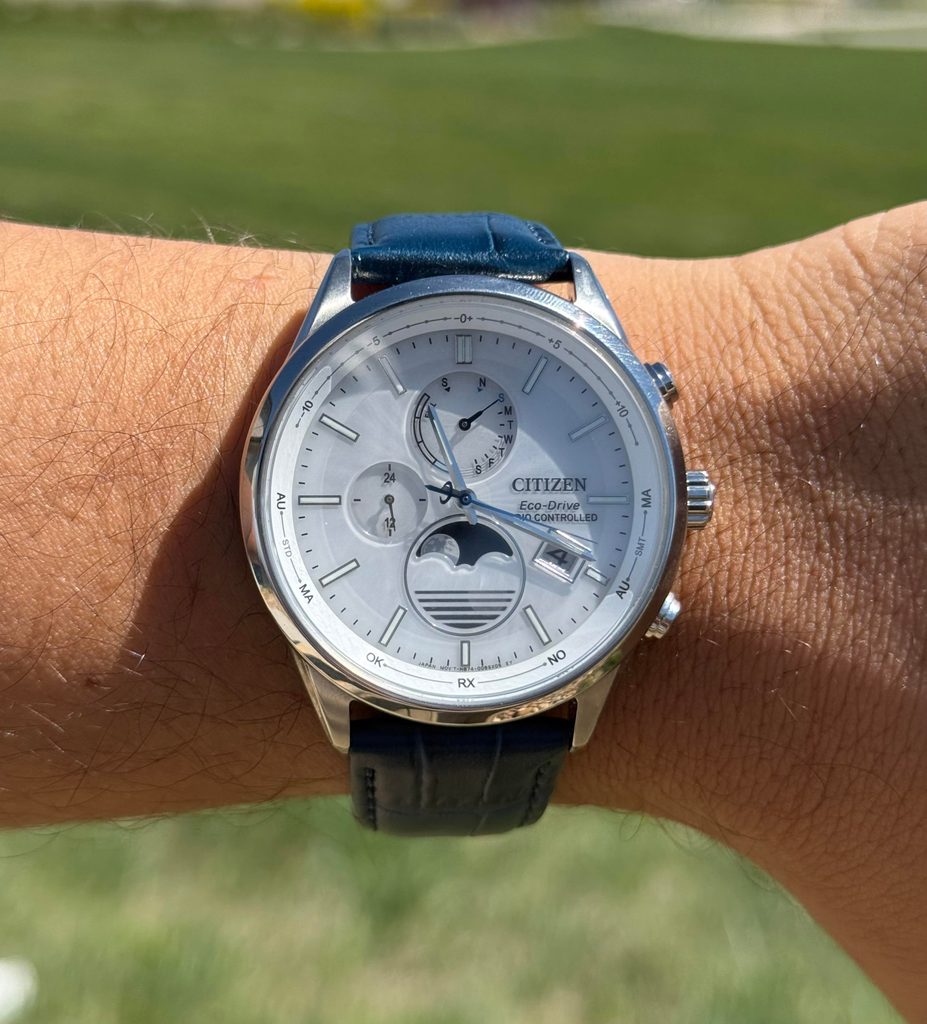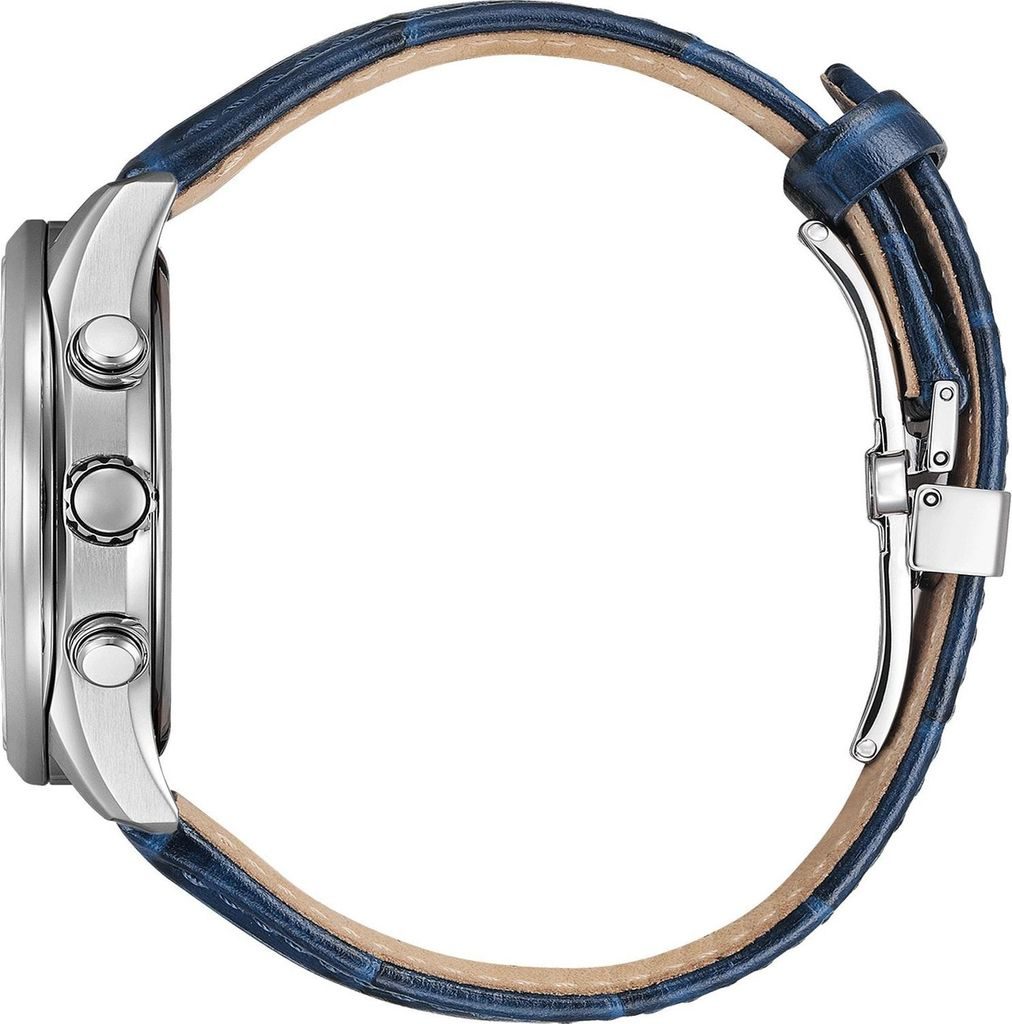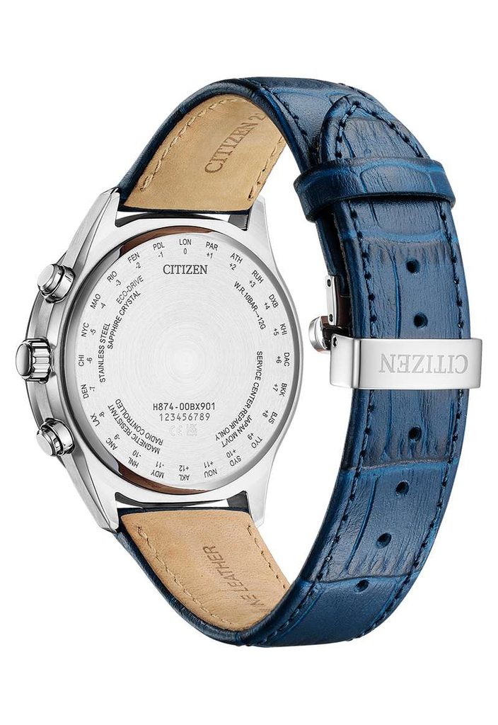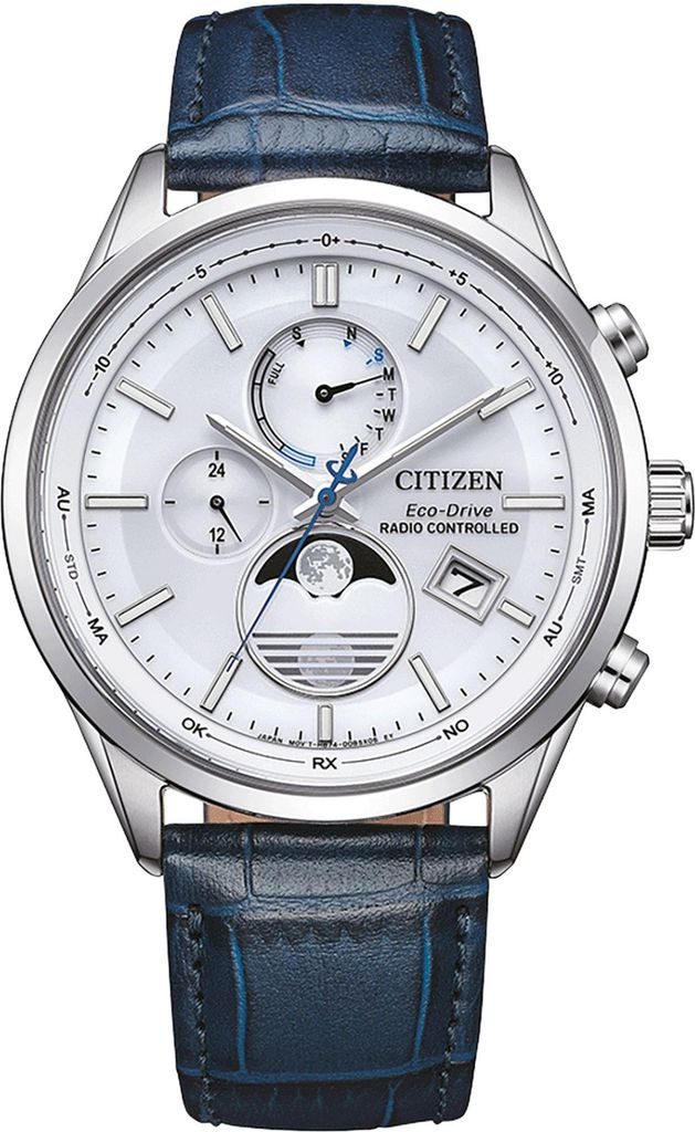 Puzdro hodiniek Citizen BY1030-09A je vyrobené z ušľachtilej ocele a je doplnené koženým remienkom. Vo vnútri tohto puzdra pracuje strojček Citizen H874, ktorý ponúka absolútne presný čas vďaka systému Radio-Controlled, t. j. synchronizácii času pomocou rádiového signálu. Spoľahnúť sa môžete aj na ďalšie funkcie, ako je indikácia stavu batérie, prevencia prebíjania, upozornenie na nedostatočné nabitie batérie pomocou dvojsekundových skokov sekundovej ručičky alebo prepnutie do úsporného režimu. Využiť môžete aj funkciu ukazovateľa fázy mesiaca na pozícii šiestich hodín, ktorá sa automaticky koriguje. Indikátor fázy mesiaca je možné prepínať aj podľa toho, či sa nachádzate na južnej alebo severnej pologuli. Na pozícii deviatich hodín sa nachádza aj 24-hodinový subciferník. Veľmi praktické je zobrazenie dátumu a dňa v týždni.