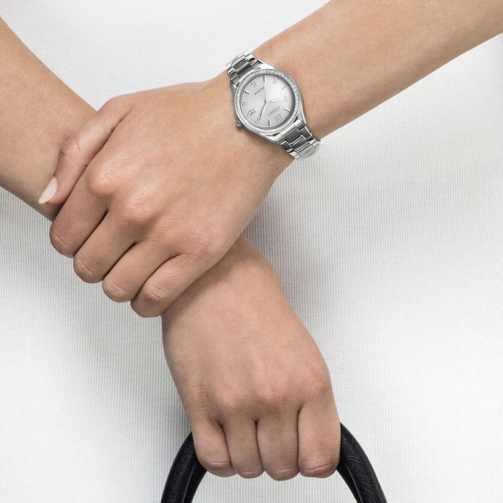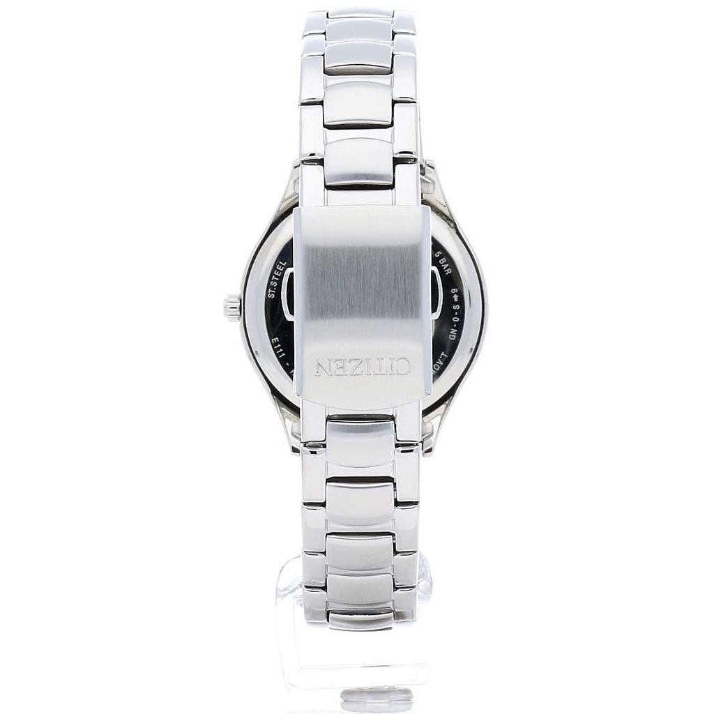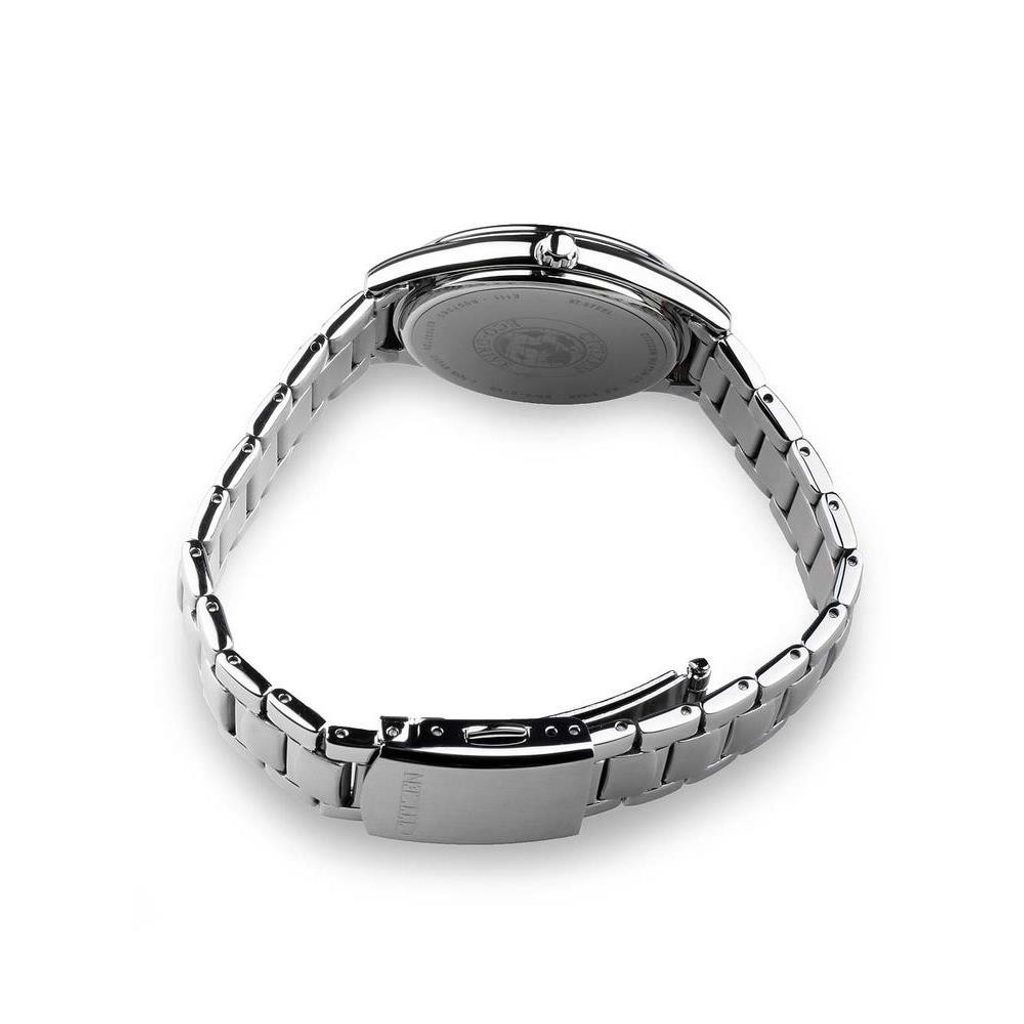 Hodinky Citizen L EO1180-82A majú puzdro vrátane náramku vyrobené z ušľachtilej ocele. Vo vnútri puzdra spoľahlivo pracuje vlastný strojček Citizen E111, ktorý má batériu nabíjanú svetelnou energiou s rezervou energie až 6 mesiacov a disponuje aj funkciou indikátora slabej batérie. Ozdoba lunety s kamienkami pekne dotvára jemný dizajn hodiniek.