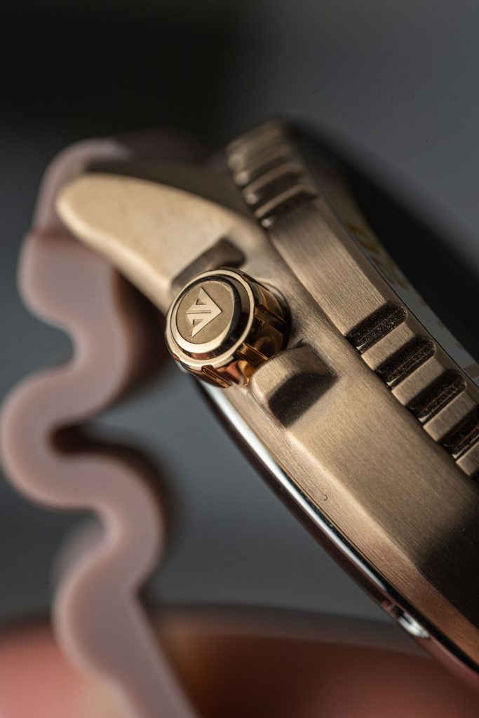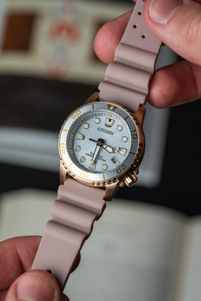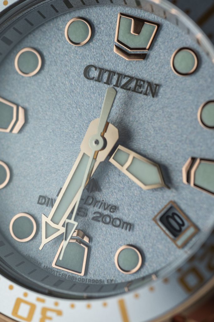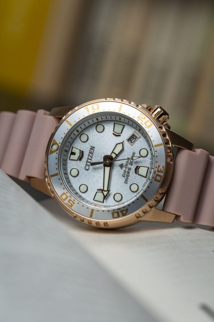 Hodinky Citizen Promaster Diver 36,5 mm EO2023-00AL majú puzdro z nehrdzavejúcej ocele s povrchovou úpravou ružovým zlatom PVD a na zápästí držia vďaka gumovému remienku. Vnútri puzdra sa nachádza vlastný strojček Citizen E168, ktorý je vybavený ľahkou dobíjacou batériou s rezervou energie až 6 mesiacov , ako aj funkciou indikátora slabej batérie. Praktickou funkciou je potom ukazovateľ dátumu na pozícii 4 hodín. Prehľadný ciferník tohto modelu je chránený minerálnym sklíčkom.