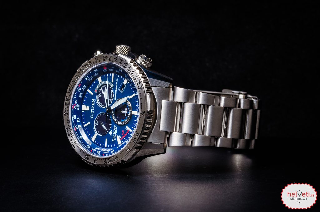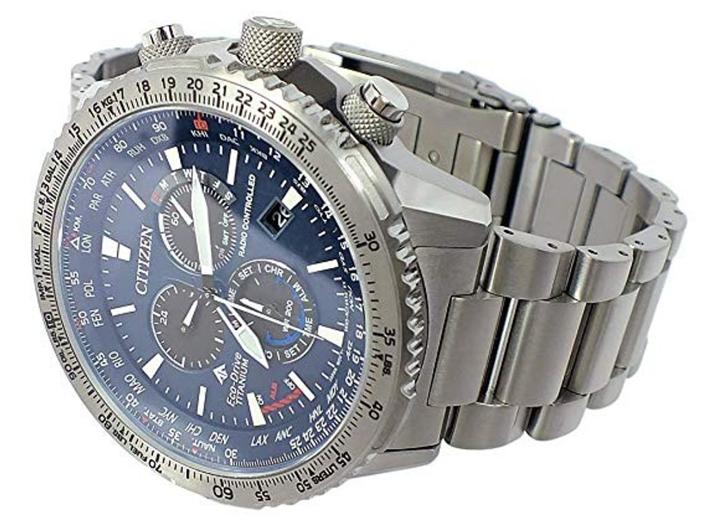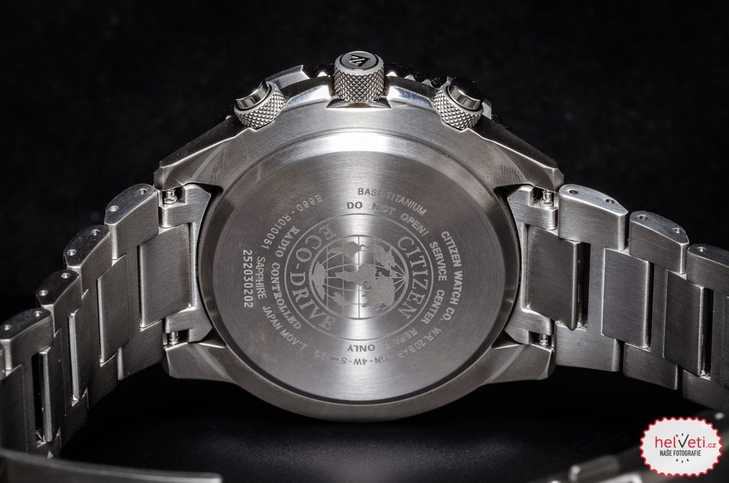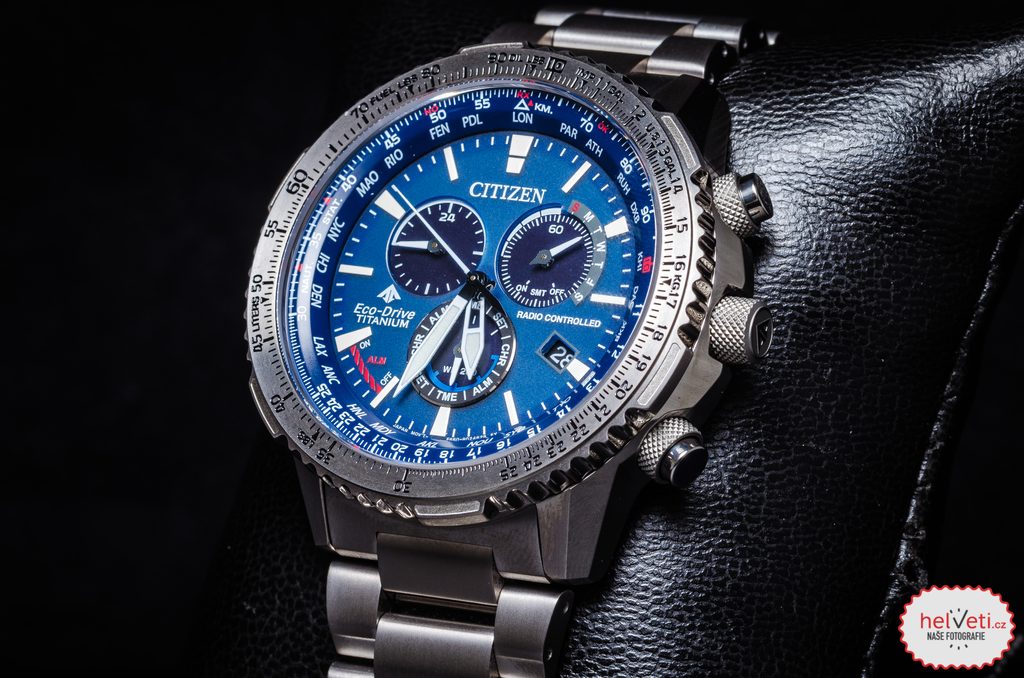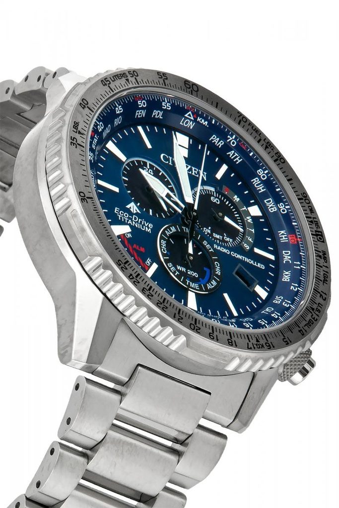 Puzdro vrátane náramku hodiniek Citizen Promaster Sky Pilot Global RC CB5010-81L je vyrobené z materiálu Super Titanium™, ktorý zaručuje nízku hmotnosť a úplné antialergické vlastnosti. V tomto puzdre pracuje vlastný strojček Citizen E660, ktorý ponúka absolútne presný čas vďaka systému Radio-Controlled, t. j. synchronizácii času pomocou rádiového signálu. Môžete sa spoľahnúť aj na ďalšie funkcie, ako je indikácia stavu batérie, prevencia prebitia, upozornenie na nedostatočné nabitie pomocou dvojsekundových skokov sekundovej ručičky alebo prepnutie do úsporného režimu. Využívať môžete aj funkciu stopiek, budíka alebo 24-hodinového subciferníka na pozícii 9 hodín. Veľmi praktické je zobrazenie dátumu a dňa v týždni. Na obojsmernej lunete sa nachádza posuvné pravidlo, ktoré používali letci na výpočet množstva zostávajúceho paliva.