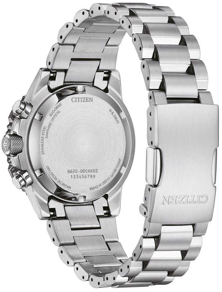 Puzdro vrátane náramku hodiniek Citizen Promaster Sky Chrono CA4664-60X je vyrobené z ušľachtilej ocele. Vo vnútri tohto puzdra pracuje vlastný strojček Citizen B620, ktorý je vybavený ľahkou dobíjacou batériou s rezervou energie až 9 mesiacov a má aj funkciu indikátora vybitia batérie. Jeho ďalšími funkciami sú stopky, dvadsaťštyrihodinový subciferník a ukazovateľ dátumu na pozícii 4 - 5 hodín. Zaujímavou funkciou stopiek je plynulý chod sekundovej ručičky, ktorá umožňuje merať čas s presnosťou na 1/5 sekundy.