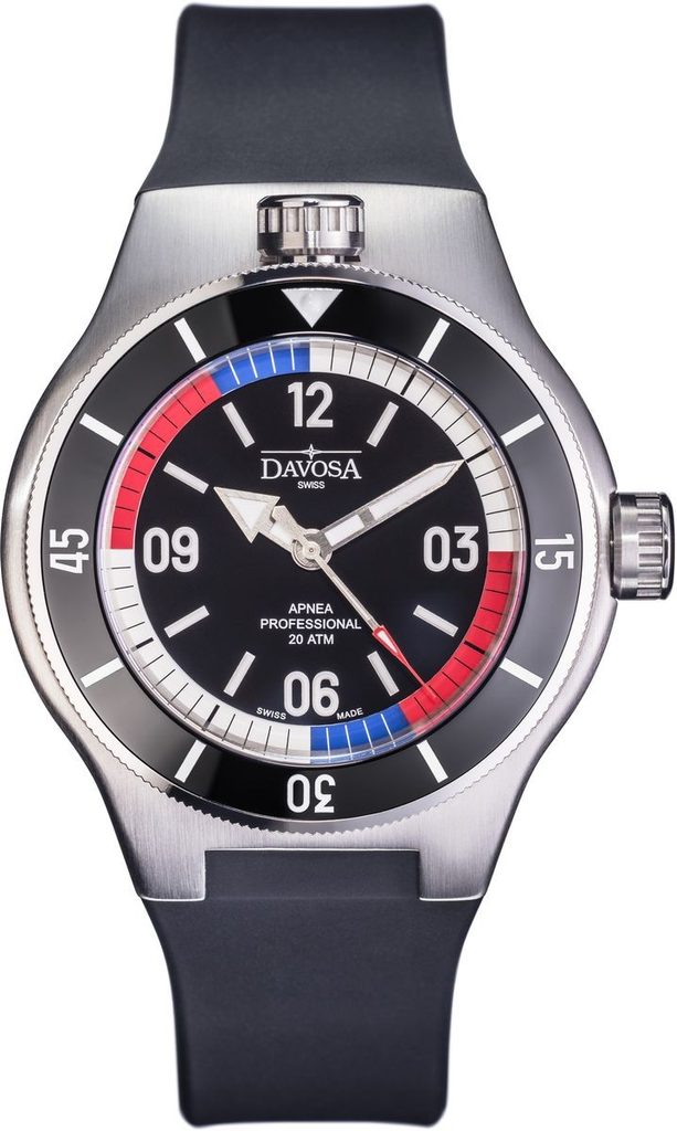 HodinkyDavosa Apnea Diver Automatic 161.568.55 sú plnokrvné potápačské hodinky s odolnosťou 200 m. Prehľadný a dokonale čitateľný ciferník chráni odolné zafírové sklíčko a jednosmerne rotujúca keramická luneta.