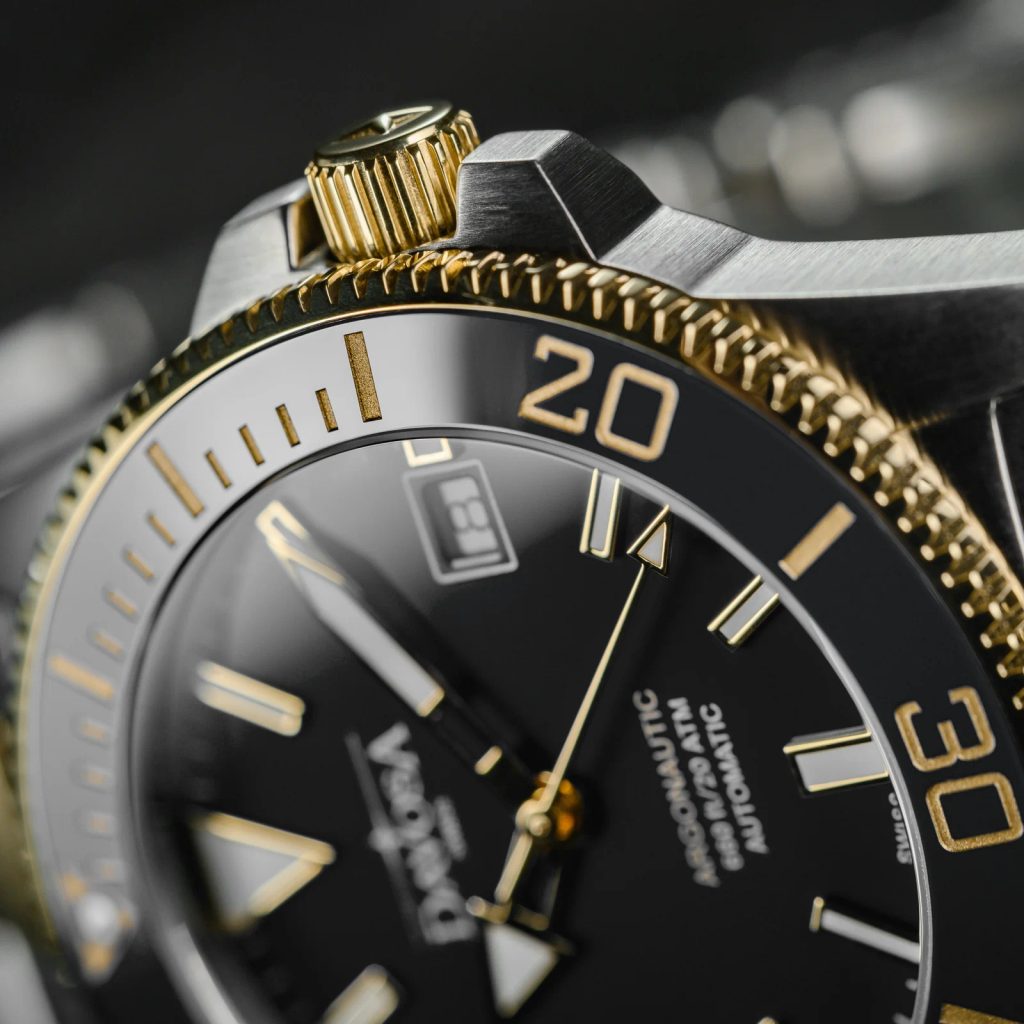 Vodotesnosť tohto modelu je 200 m ( 20 ATM), takže zvládne takmer akýkoľvek kontakt s vodou vrátane hlbokomorského potápania. Túto vysokú vodotesnosť podporuje skrutkovacia korunka. Potápačská, jednosmerne otočná luneta v zlatej PVD úprave má vložku z vysoko odolnej keramiky. Hodinky drží na zápästí štýlový dvojfarebný oceľový náramok.