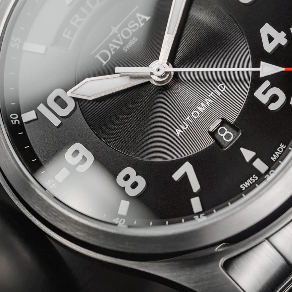 Puzdro hodiniek Davosa 161.585.50 je vyrobené z ušľachtilej ocele a vhodne ho dopĺňa náramok z rovnakého materiálu. Vo vnútri puzdra tiká mechanický strojček DAV 3023 (na báze ETA 2834 alebo Sellita SW 240) s automatickým naťahovaním. Jeho prácu s frekvenciou 28 800 polfrekvencií za hodinu možno pozorovať vďaka priehľadnému ciferníku. Na pozícii 6 hodín nájdeme ukazovateľ dátumu. Ukazovateľ dňa v týždni, ktorý je zobrazený v podobe celého slova, sa nachádza na pozícii 12 hodín.