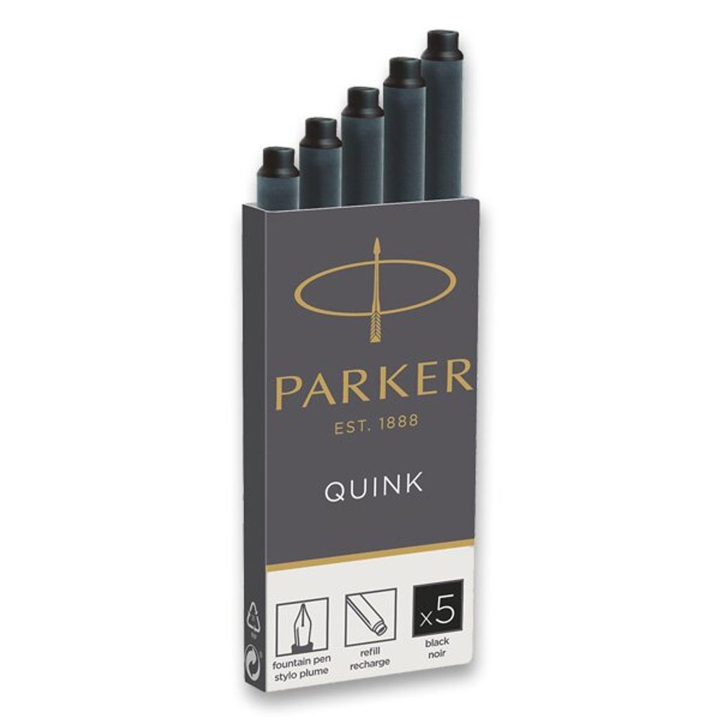 Dlhé fľaštičky s atramentom Parker. Jedno balenie obsahuje 5 kaziet. Atrament je trvalý.
