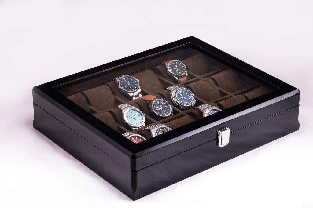 Elegantný box na 18 hodiniek je vyrobený z kvalitného orechového dreva a má vysoký klavírny lesk, ktorý jeho povrchu dodáva výnimočný lesk a sofistikovaný vzhľad. Priehľadné veko vám umožní prezrieť si hodinky bez toho, aby ste museli krabičku otvárať.