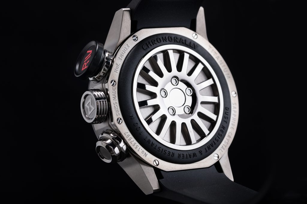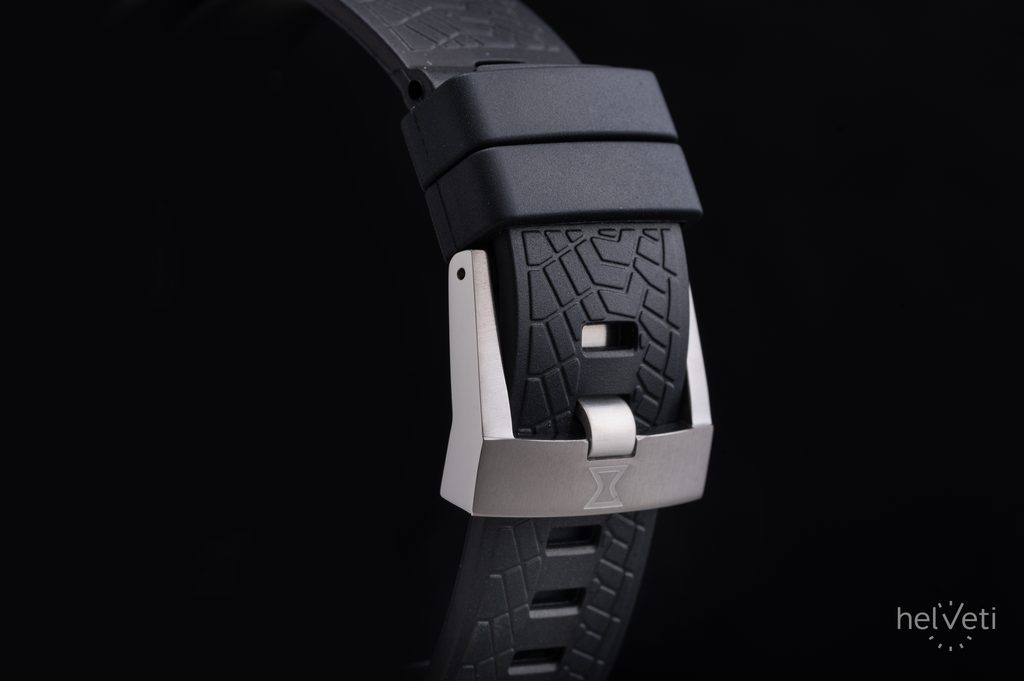 Puzdro je vyrobené z titánu v striebornom vyhotovení a je doplnené čiernym gumovým remienkom so vzorom pneumatiky. Vodotesnosť tohto modelu je 100 m, takže hodinky vydržia aj občasné plávanie na hladine a sprchovanie. Priemer puzdra je 45 mm, takže ide o pomerne veľké hodinky.