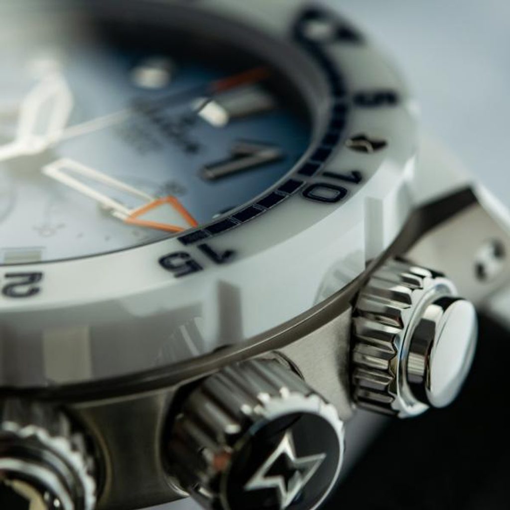 Puzdro hodiniek je vyrobené z kvalitného titánu a na ruke drží vďaka bielemu gumenému remienku. Práve vďaka titánovému puzdru v kombinácii s gumovým remienkom vážia hodinky napriek svojej mohutnosti len 130 g, čo ich robí veľmi príjemnými na nosenie. Svetlomodrý ciferník chráni 3 mm hrubé zafírové sklíčko, ktoré je vysoko odolné voči poškriabaniu.