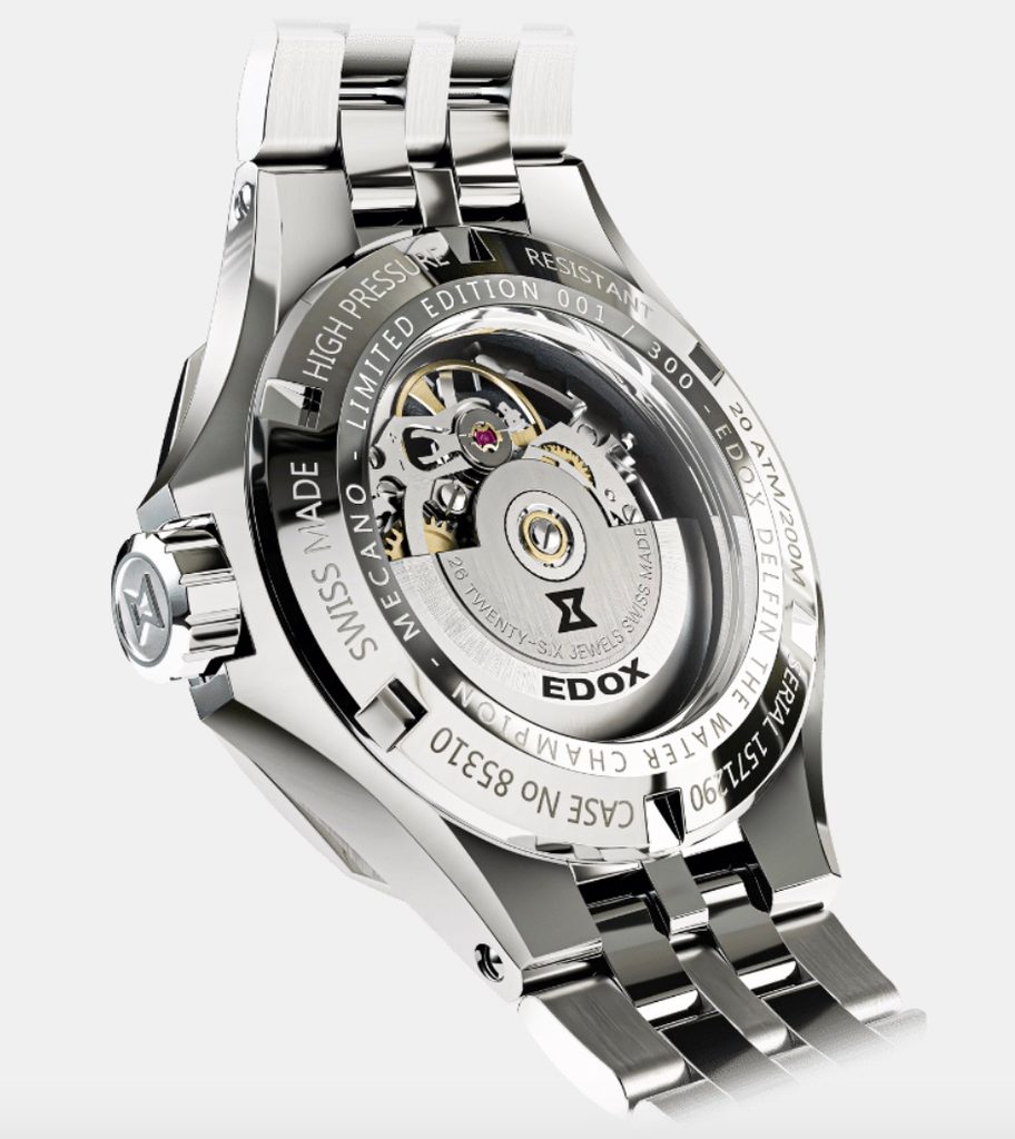 Puzdro hodiniek je vyrobené z kvalitnej nehrdzavejúcej ocele, na ktorú nadväzuje oceľový náramok. Čierny skeletový ciferník chráni zafírové sklíčko, ktoré je odolné voči akémukoľvek poškriabaniu. Hodinky sa vyznačujú vysokou vodotesnosťou do 200 m, spoľahlivosťou, patentovanou dvojito utesnenou skrutkovacou korunkou a špecifickým dizajnom 12-strannej lunety, ktorý je pre modelový rad Delfin ikonický od jeho vzniku. Charakteristickým znakom hodiniek je skeletový ciferník, cez ktorý môžete pozorovať prácu mechanického strojčeka.