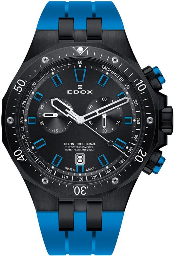 Model EDOX Delfin Quartz Chronograph 10109-3CA-BUIN sa vyznačuje typickým dizajnom potápačských hodiniek, teda samozrejme výbornou čitateľnosťou, luminiscenciou a jednosmerne otočnou lunetou. Vodotesnosť 200 m zaručuje odolnosť pri akomkoľvek kontakte s vodou vrátane potápania.
