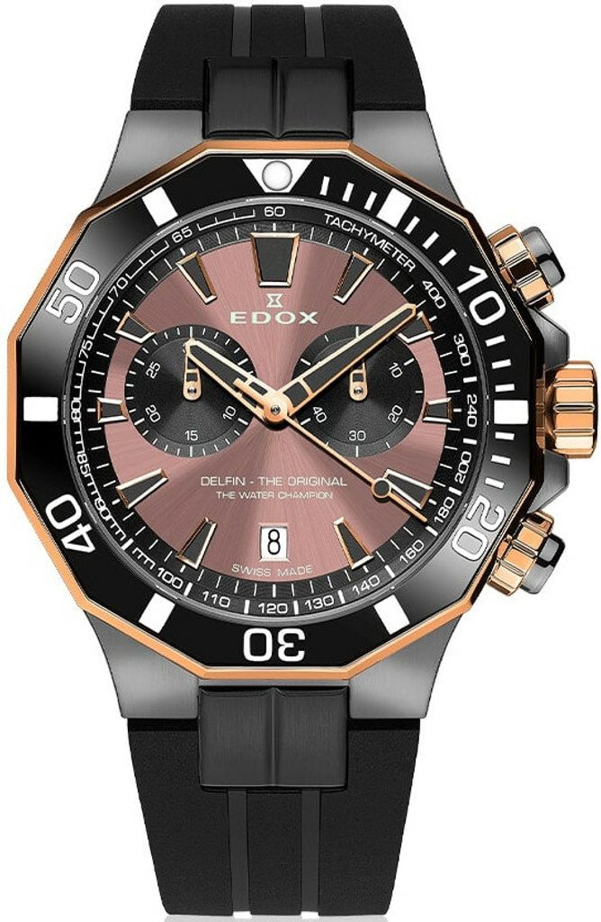EDOX Delfin Quartz Chronograph 10112-357GRNCA-BRNR sú pánske športové hodinky zo série Delfin. Tento modelový rad je určený najmä pre milovníkov vodných športov a potápania s hodinkami.