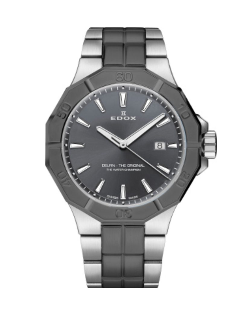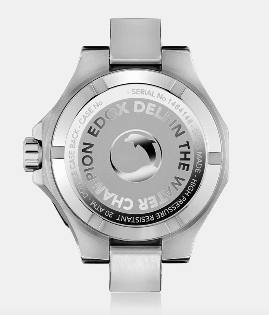 Model EDOX Delfin Quartz Date 53021-3GM-GIN sa vyznačuje typickým dizajnom športových hodiniek, takže samozrejmosťou je výborná čitateľnosť, luminiscencia SuperLuminova na ručičkách a indexoch. Vodotesnosť 200 m zaručuje odolnosť pri akomkoľvek kontakte s vodou vrátane hĺbkového potápania a je podporená skrutkovacou korunkou.