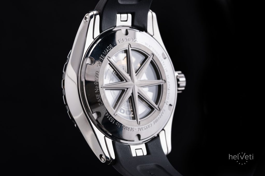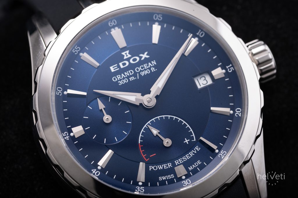 Hodinky EDOX Grand Ocean 94500-3CA-BUIN poháňa automatický strojček 945 (základňa SW279-1) s funkciou hacking, ktorá umožňuje nastaviť presný čas (sekundová ručička sa zastaví po vytiahnutí korunky). Hodinky majú funkciu indikátora hrdzavosti. Ukazovateľ dátumu sa nachádza na pozícii 3 hodín.