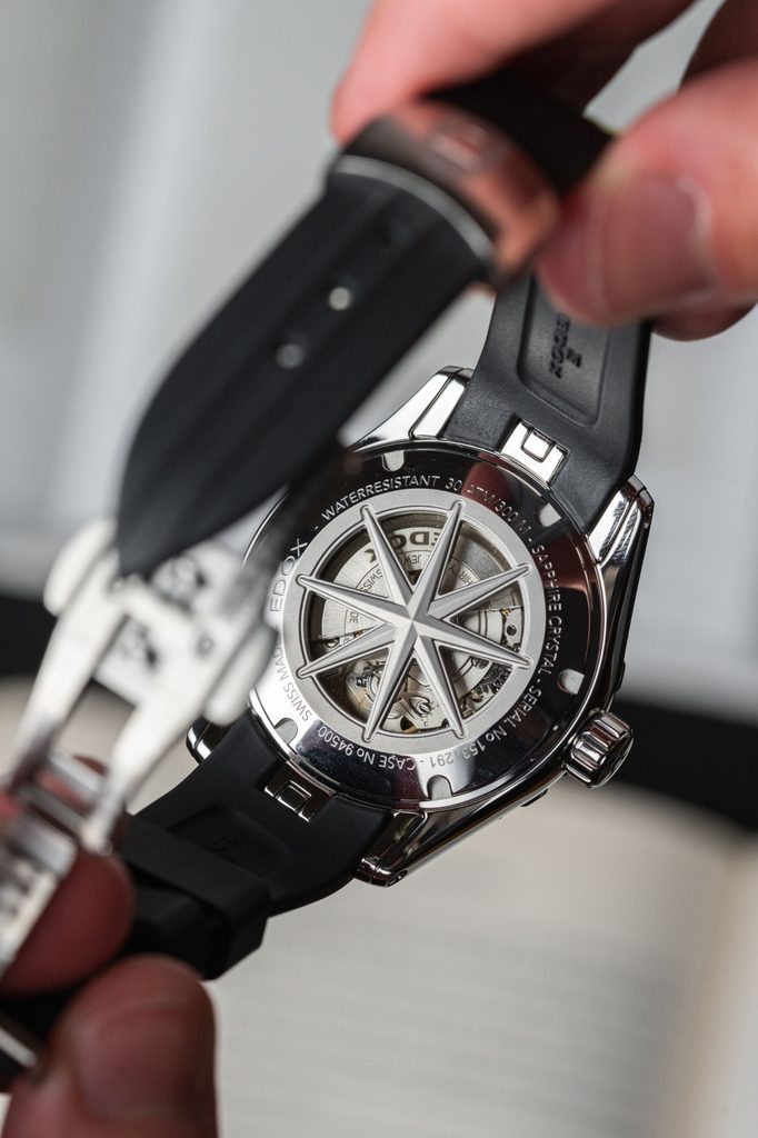 Hodinky EDOX Grand Ocean 94500-3CA-BUIN poháňa automatický strojček 945 (základňa SW279-1) s funkciou hacking, ktorá umožňuje nastaviť presný čas (sekundová ručička sa zastaví po vytiahnutí korunky). Hodinky majú funkciu indikátora hrdzavosti. Ukazovateľ dátumu sa nachádza na pozícii 3 hodín.