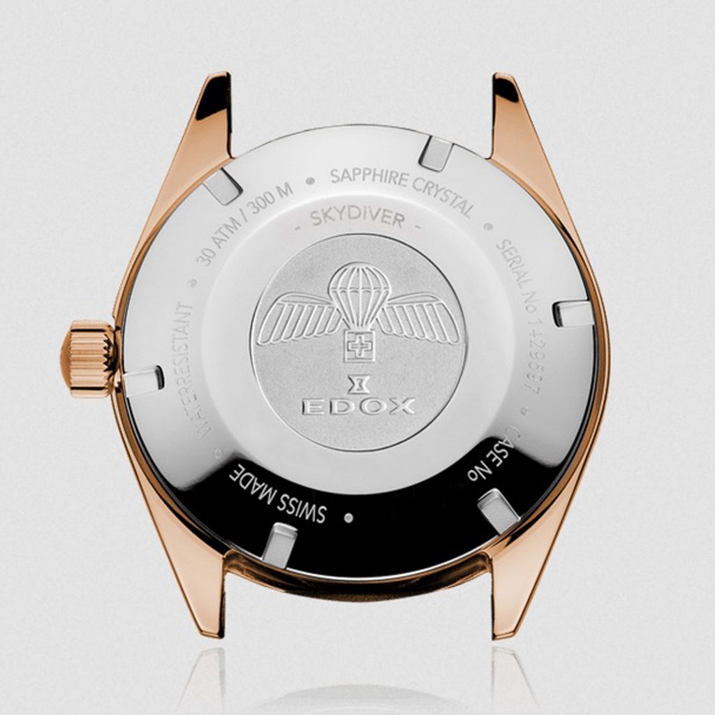 Na zadnom kryte hodiniek nájdete vygravírovaný symbol švajčiarskych výsadkárov ako odkaz na pôvodný model SkyDiver.