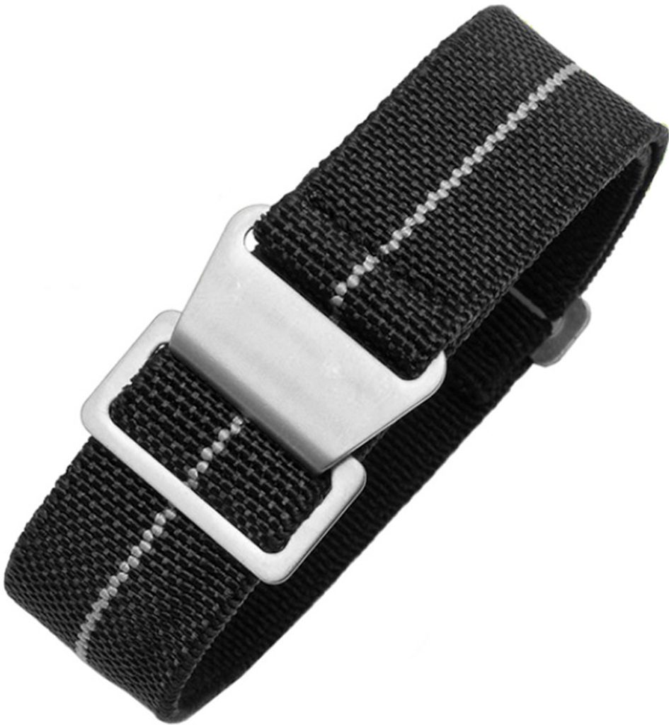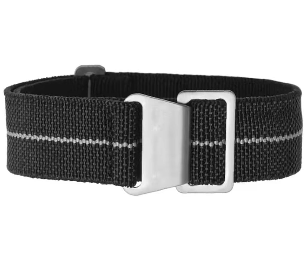 Textilný elastický remienok čiernej farby so svetlosivým tenkým prúžkom uprostred. Tento typ remienka je veľmi praktický a pohodlný na nosenie.