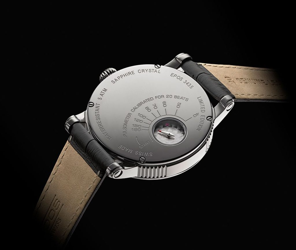 Hodinky Epos Oeuvre D’Art 3435.313.20.26.25 zaujmú svojim dizajnom na prvý pohľad. Priehľad cez ciferník, atypicky umiestnený subciferník ako ukazovateľ času, či viditeľné označenie sériového čísla. To všetko doplnené o pulzomer na zadnej strane puzdra.