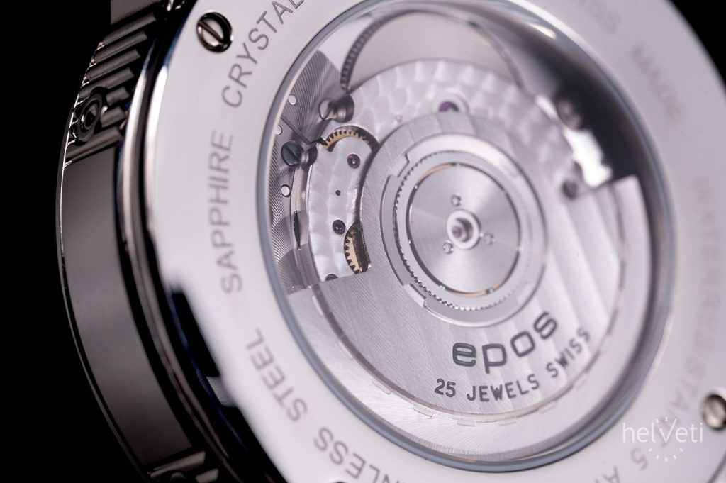 Hodinky sú osadené automatickým švajčiarskym strojčekom Sellita SW300 s in-house modulom mesačnej fázy a rezervou chodu až 42 hodín. Jeho 28.800 kmitov za hodinu je možné pozorovať cez priehľadné zadné viečko. Vlastná nadstavba mesačnej fázy, ktorú Epos nazýva „Big Moon“, zobrazuje oproti iným prevedeniam tejto komplikácie reálne zobrazenie mesačnej fázy. Strojček disponuje funkciou hacking, kedy sa pri nastavovaní času zastaví sekundová ručička.